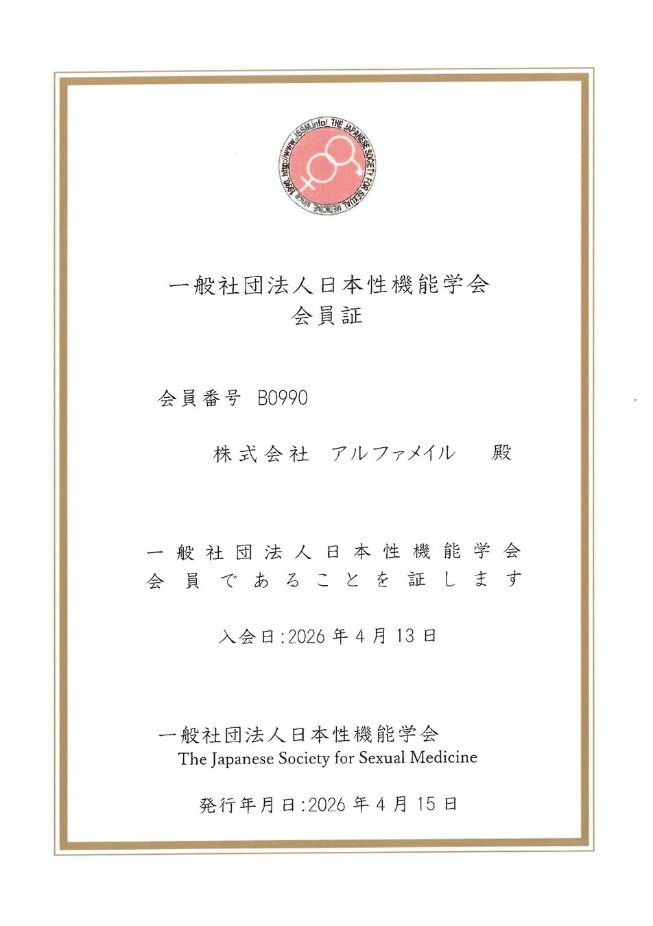 日本性機能学会に所属している企業として最新の知見を取り入れることは、株式会社アルファメイルが目指す「日本人男性のQoL向上」という目的達成の一助になると確信しております。