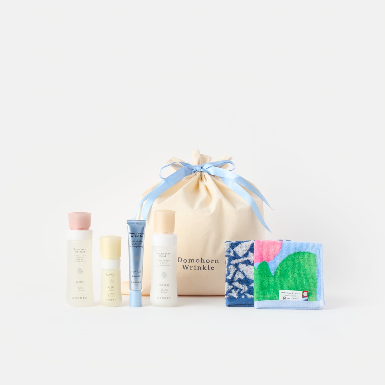 会場内で、限定ギフトセットやその他のドモホルンリンクル製品、ポジティブリズム製品をご購入いただいた方に、会場限定の特典製品を進呈いたします。さらに2万円以上の購入でヘラルボニーのタオルハンカチも1枚贈呈します
