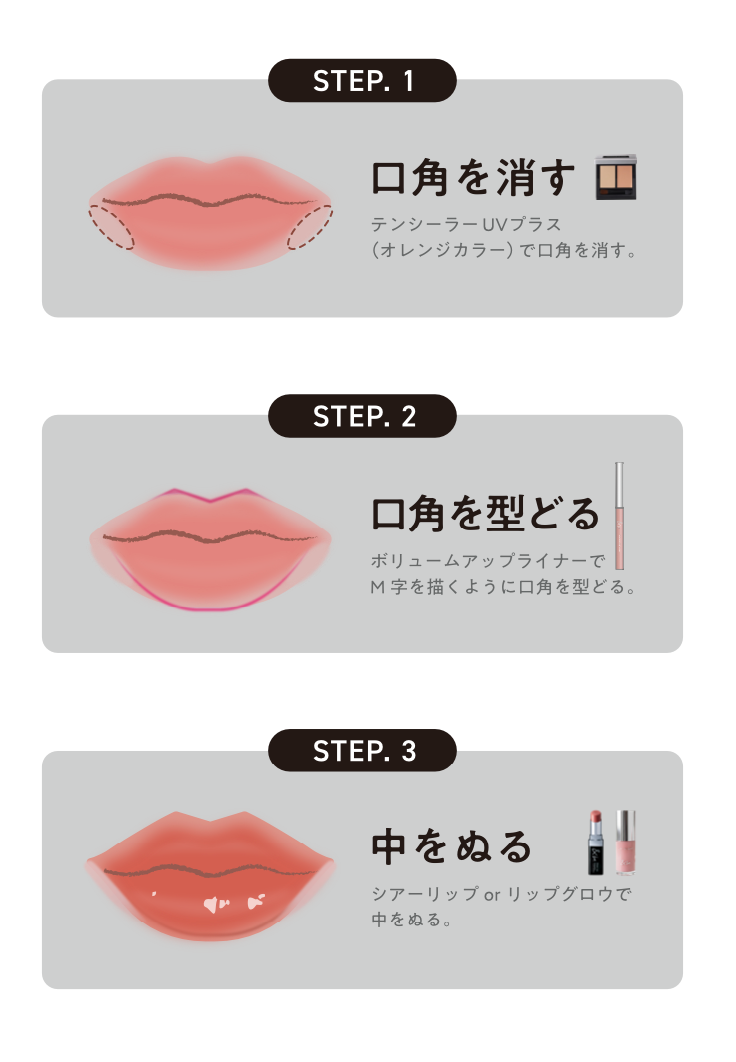 ①「&be テンシーラー UVプラス」のオレンジカラーで口角のくすみをカバーします。