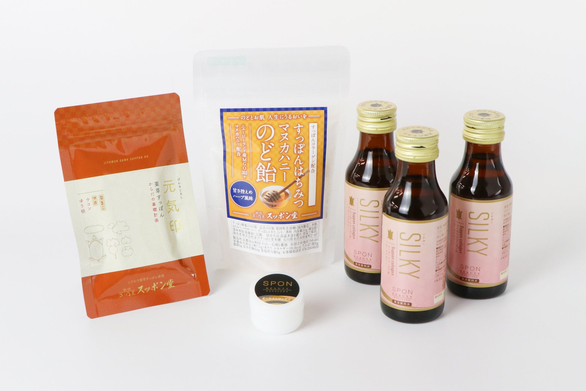 元気印(18カプセル)×1袋 すっぽんコラーゲンドリンク「シルキー」100ml×3本 〈特典〉うるおいオールインワンゲル 10g すっぽんはちみつマヌカハニーのど飴 10粒 |