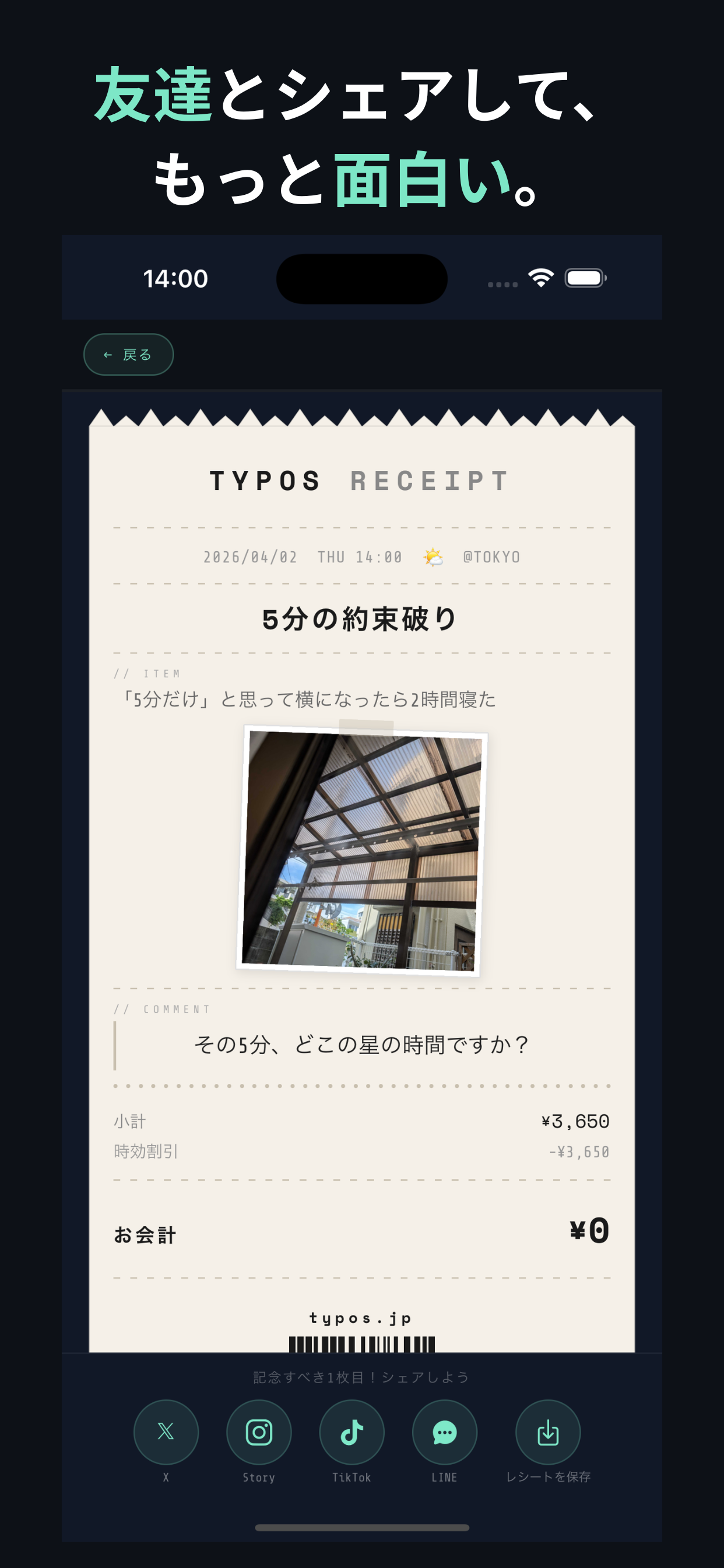 株式会社Remoi(本社:東京都北区、代表:堀井 拓斗)は、2026年4月21日(火)、失敗を入力するとAIがツッコミと称号を添えて「時効レシート」を発行するアプリ『TYP0S RECEIPT(タイポス レシート)』を、iOS・Androidで同時配信開始いたします。成功だけが可視化されるSNS時代と、AIが完璧な成果物を生成する時代。その狭間で、「失敗できること自体が人間である証明」という価値観を提案する新しいアプリです。