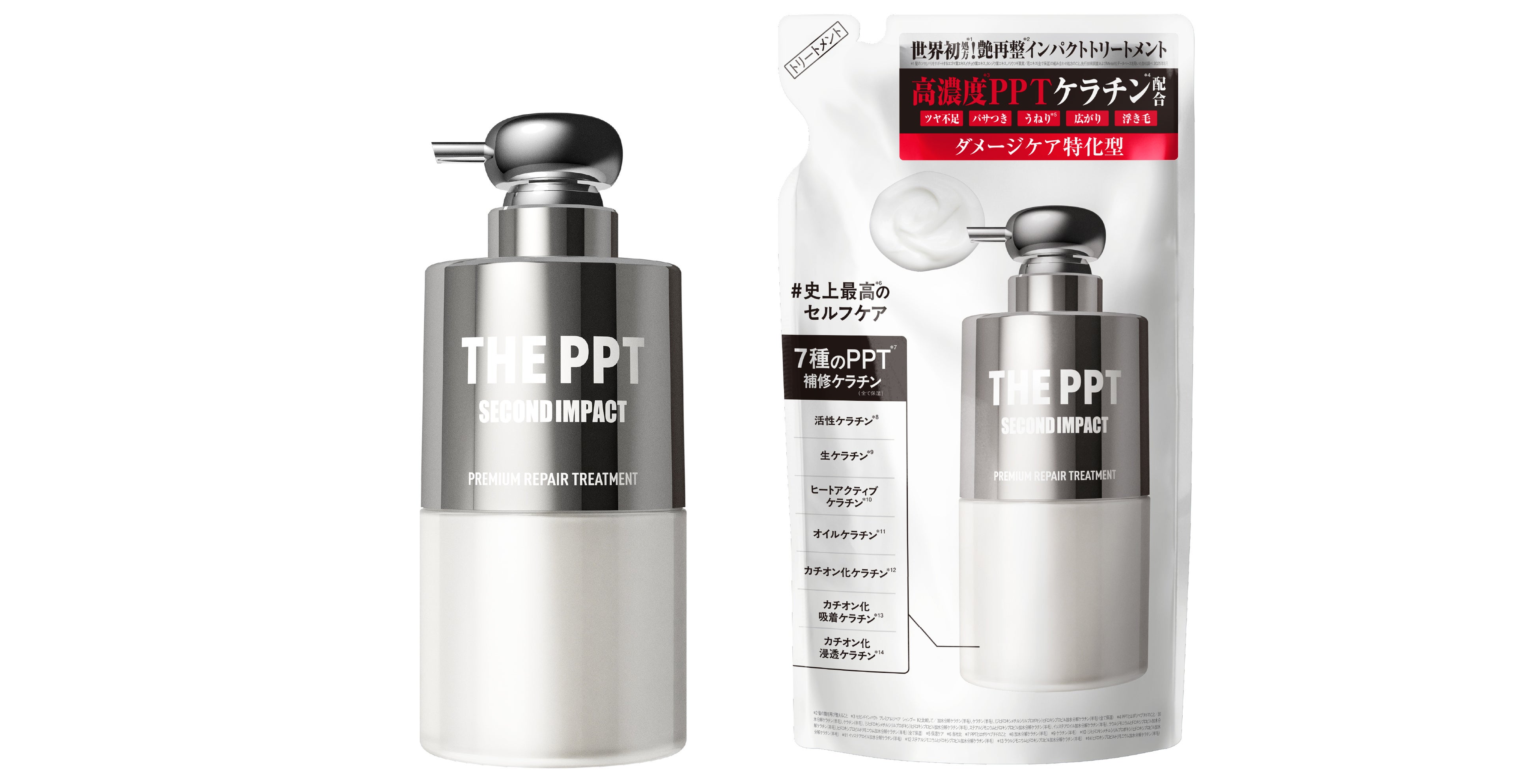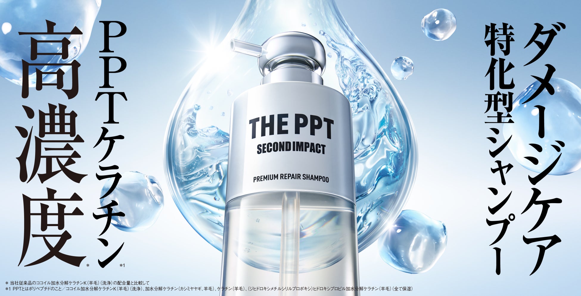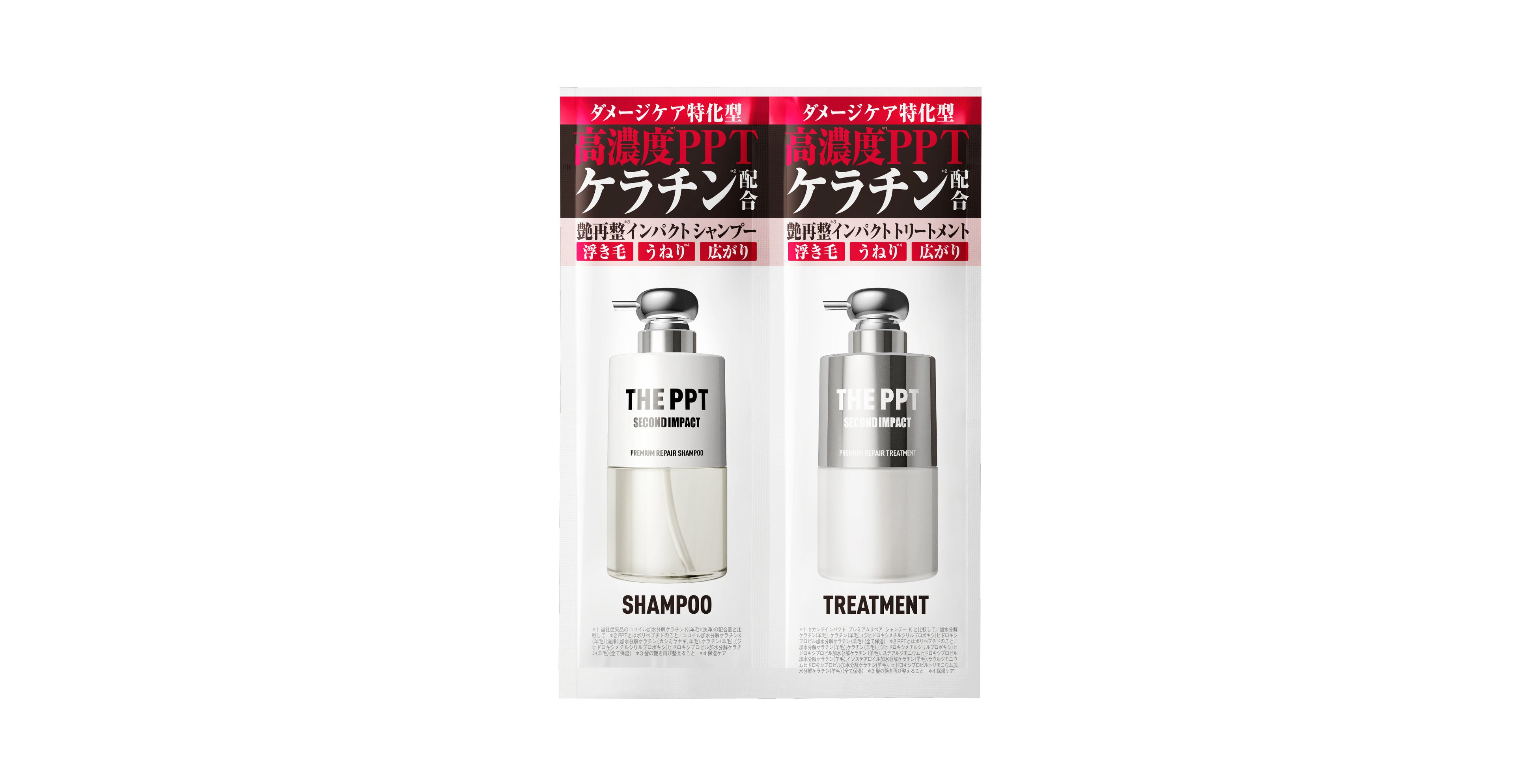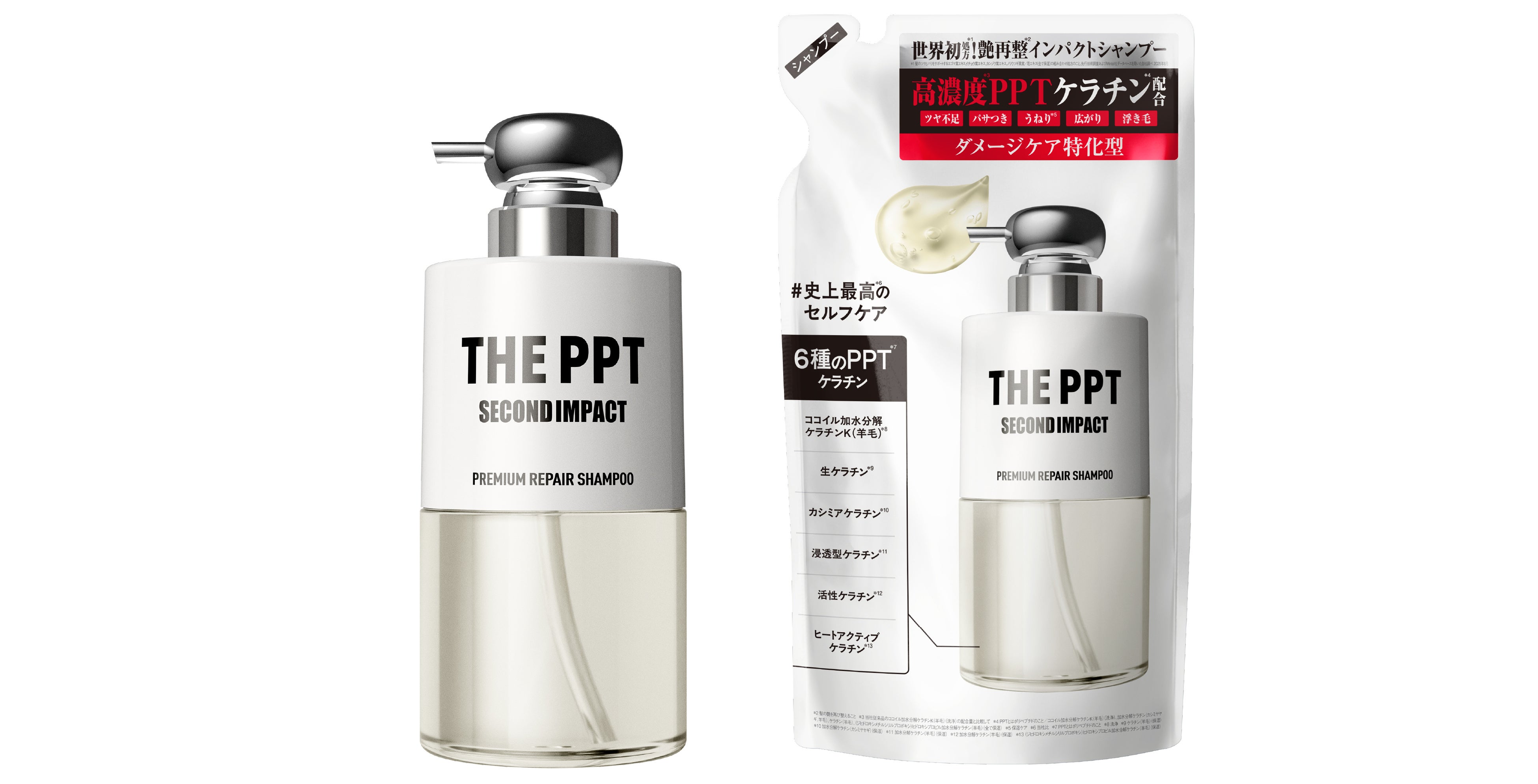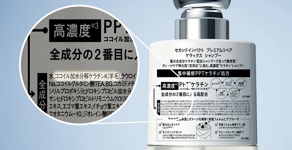 *自社内 *1 当社従来品のココイル加水分解ケラチンK(羊毛)(洗浄)の配合量と比較して *2 PPTとはポリペプチドのこと:【セカンドインパクト プレミアムリペア シャンプー Kの場合】ココイル加水分解ケラチンK(羊毛)(洗浄)、加水分解ケラチン(カシミヤヤギ、羊毛)、ケラチン(羊毛)、(ジヒドロキシメチルシリルプロポキシ)ヒドロキシプロピル加水分解ケラチン(羊毛)(全て保湿) *3 髪の艶を再び整えること *4 PPTとはポリペプチドのこと *5 ココイル加水分解ケラチンK(羊毛)(洗浄) *6 当社比 *7 髪内部のダメージのこと *8 アミノエチルチオコハク酸ジアンモニウム/「トステアⓇ」はオリエンタルケミカル㈱の登録商標です。 *9 ジマレイン酸プロピレンジアンモニウム *10 クサソテツ葉/茎エキス *11 傷んだ髪を選択的に補修すること *12 PPTとはポリペプチドのこと/ケラチン(羊毛)、(ジヒドロキシメチルシリルプロポキシ)ヒドロキシプロピル加水分解ケラチン(羊毛)(全て保湿)/ココイル加水分解ケラチンK(羊毛)(洗浄成分)、加水分解ケラチン(カシミヤヤギ、羊毛)(保湿)[セカンドインパクト プレミアムリペア シャンプー Kに配合]/加水分解ケラチン(羊毛)、ステアルジモニウムヒドロキシプロピル加水分解ケラチン(羊毛)、イソステアロイル加水分解ケラチン(羊毛)、ラウルジモニウムヒドロキシプロピル加水分解ケラチン(羊毛)、ヒドロキシプロピルトリモニウム加水分解ケラチン(羊毛)(全て保湿)[セカンドインパクト プレミアムリペア ヘアトリートメント Kに配合] *13 ケラチン(羊毛)(保湿) *14 加水分解ケラチン(カシミヤヤギ)(保湿) *15 加水分解ケラチン(羊毛)(保湿) *16 (ジヒドロキシメチルシリルプロポキシ)ヒドロキシプロピル加水分解ケラチン(羊毛)(保湿) *17 ココイル加水分解ケラチンK(羊毛)(洗浄)、加水分解ケラチン(カシミヤヤギ、羊毛)、ケラチン(羊毛)、(ジヒドロキシメチルシリルプロポキシ)ヒドロキシプロピル加水分解ケラチン(羊毛)(全て保湿) *18 ステアルジモニウムヒドロキシプロピル加水分解ケラチン(羊毛)、ラウルジモニウムヒドロキシプロピル加水分解ケラチン(羊毛)、ヒドロキシプロピルトリモニウム加水分解ケラチン(羊毛)(全て保湿) *19 加水分解ケラチン(羊毛)、ケラチン(羊毛)、(ジヒドロキシメチルシリルプロポキシ)ヒドロキシプロピル加水分解ケラチン(羊毛)、ステアルジモニウムヒドロキシプロピル加水分解ケラチン(羊毛)、イソステアロイル加水分解ケラチン(羊毛)、ラウルジモニウムヒドロキシプロピル加水分解ケラチン(羊毛)、ヒドロキシプロピルトリモニウム加水分解ケラチン(羊毛)(全て保湿)