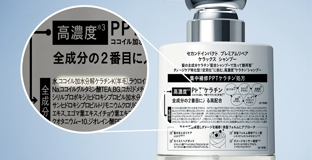 ① 全成分の2番目に「PPTケラチン*⁵」を圧倒的*⁶高濃度*¹配合