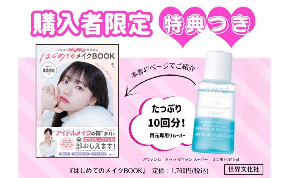 世界文化社は、“アイドルメイクの神”夢月さんによる「メイクの基本」をおうちの人と一緒に学べるメイクの教科書『はじめてのメイクBOOK』を4月26日(日)に発売します。発売に先駆け、購入者特典が決定! 対象店にて実施する、特典の詳細をお知らせします。