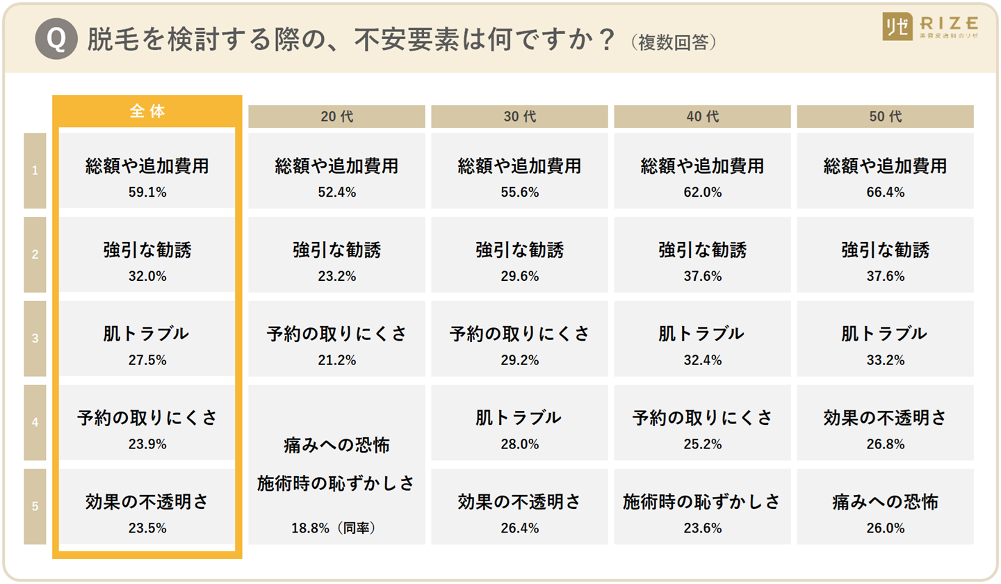 ■④【脱毛への不安要素】全年代最多は「総額や追加費用(59.1%)」、次点に「強引な勧誘(32.0%)」