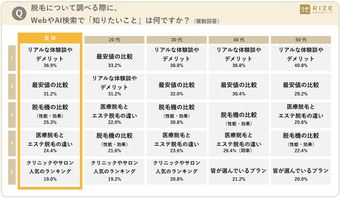 ■⑤【脱毛について検索で知りたい情報は?】①リアルな体験談やデメリット ②最安値の比較 ③脱毛機の比較