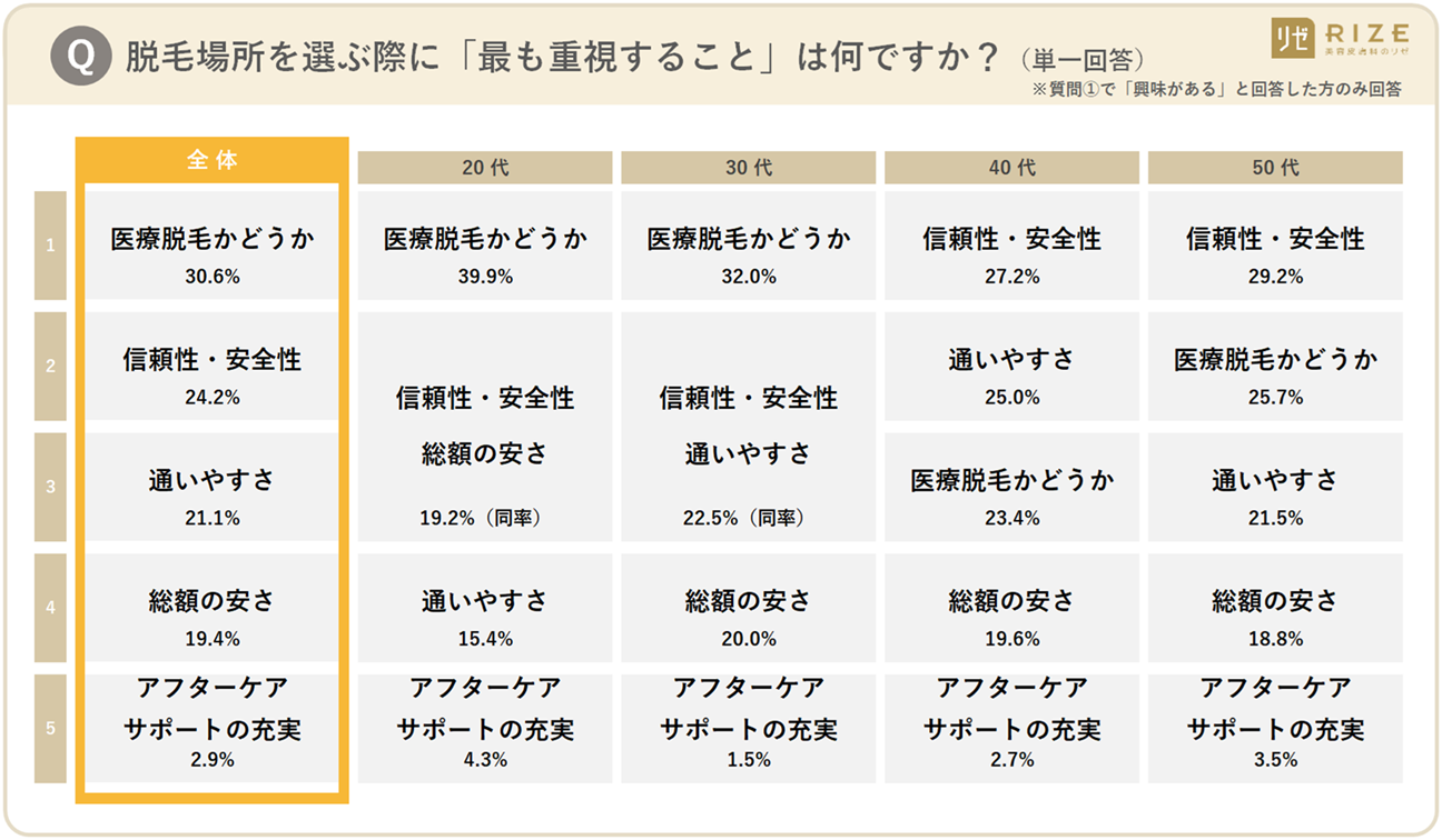 全体で「医療脱毛かどうか(30.6%)」が最多となり、特に20代では約4割(39.9%)が最重視している一方で、年代が上がるにつれて「信頼性・安全性」や「通いやすさ」を求める傾向に。