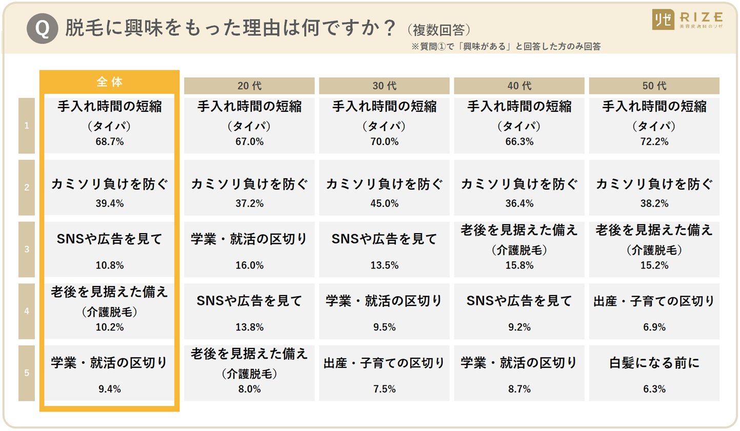 全体で「手入れ時間の短縮(68.7%)」が1位となり、特に50代では7割超(72.2%)がタイパを重視する一方、20代の「学業・就活の区切り(16.0%)」や40代・50代の「介護脱毛(平均約14%)」といったライフステージ特有の動機も顕著に表れており、若年層の自己投資から中高年層の将来への備えまで、年代ごとに異なる明確な目的意識が混在していることが分かりました。