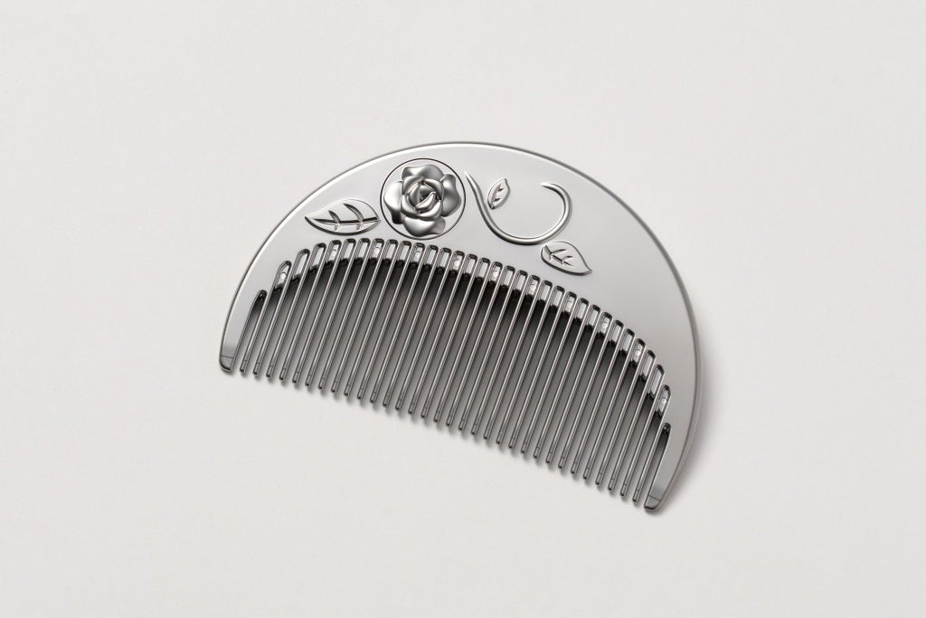 LumiKA+の核となるのは、柿原工業が「自動車部品」の量産で長年培ってきた樹脂めっき技術です。「樹脂めっきが持つ静電気分散効果を、もっと気軽に持ち歩き、日常のあらゆるシーンで実感してほしい」という想いから、2025年よりメタルコームの開発・販売に着手。既に発売済みのコームの機能性はそのままに、手のひらに収まるコンパクトサイズに凝縮した『薔薇小町(ばらこまち)』が誕生しました。