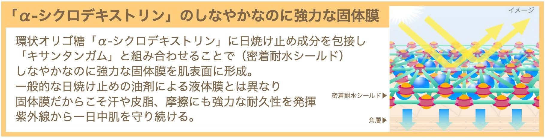 *1 日焼け止め成分を肌上で固体膜にする技術(クリーム剤型) *2 シクロデキストリン、キサンタンガム、t-ブチルメトキシジベンゾイルメタン、ホモサレート、オクトクリレン、サリチル酸エチルヘキシル *3 ナイアシンアミド、3-O-エチルアスコルビン酸、グリチルレチン酸ステアリル、カミツレ花エキス、セイヨウオトギリソウ花/葉/茎エキス、トウキンセンカ花エキス、フユボダイジュ花エキス、ヤグルマギク花エキス、ローマカミツレ花エキス