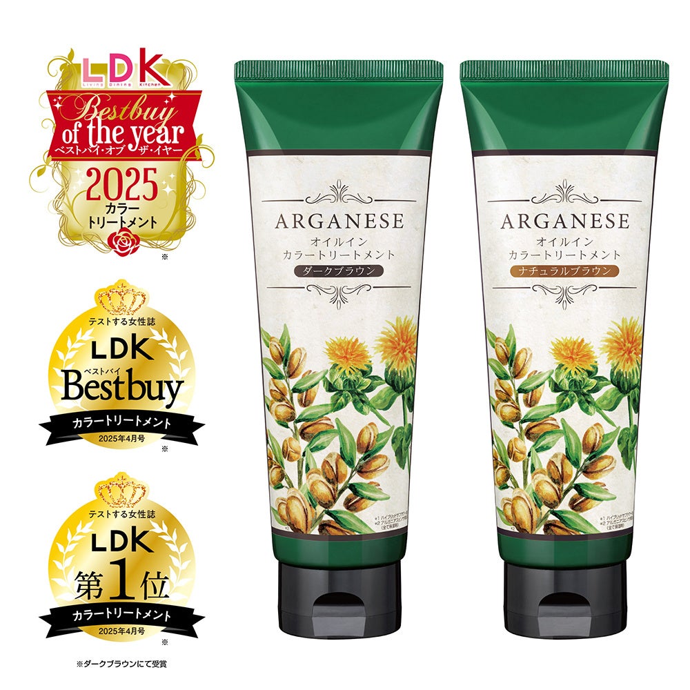 白髪ケアアイテム「アルガネーゼ オイルインカラートリートメント ダークブラウン」は、テストする女性誌『LDK』(株式会社晋遊舎)2025年4月号にて、カラートリートメント部門の「第1位」および「ベストバイ」を受賞。さらに、同誌2026年1月号では「LDK ベストバイ オブ・ザ・イヤー 2025」のカラートリートメント部門に選出され、あわせて3冠を達成いたしました。仕上がり、成分、使用感のすべてにおいて高い評価を獲得しており、その確かな品質と実力に注目が集まっています。