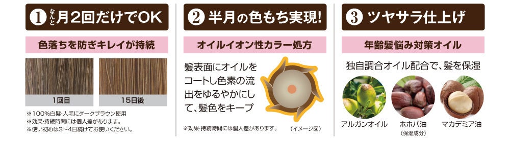 気になる白髪を補修しながらしっかりと染め上げ、最大で15日間髪色が長持ちします*。