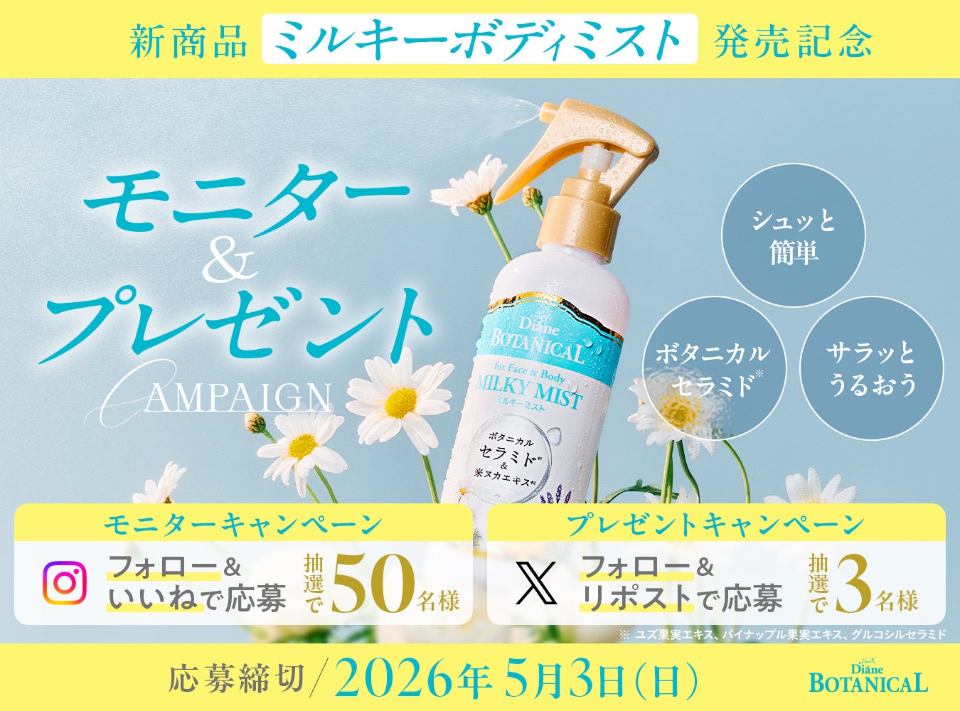 発売を記念して、ダイアンボタニカルの公式InstagramとXにて、本商品(ダイアンボタニカル ミルキーミスト)が抽選で当たるキャンペーンを実施いたします。