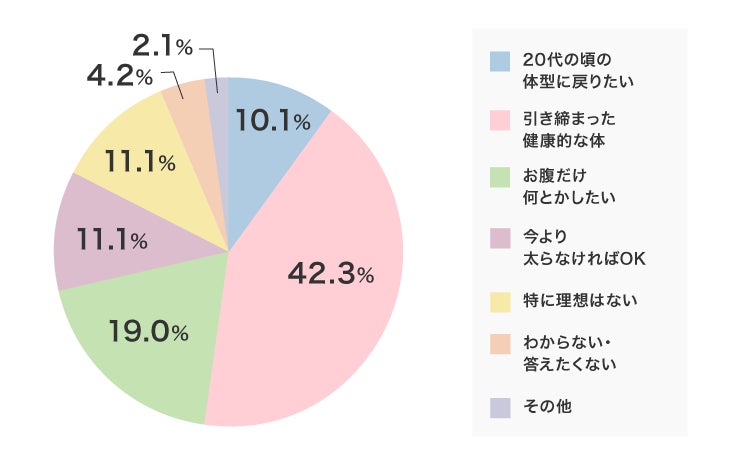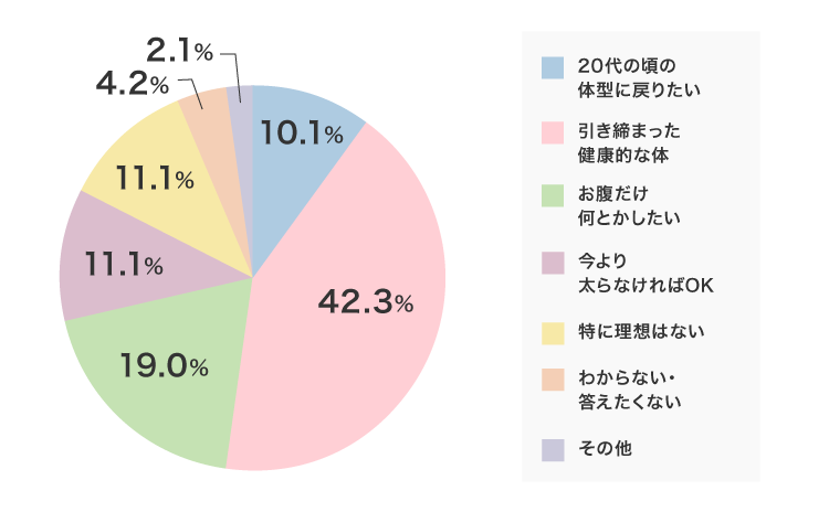 理想の自分の姿に一番近いのは「引き締まった健康的な体」が4割をこえ、次に多かった「お腹だけはなんとかしたい」の2倍以上になりました。