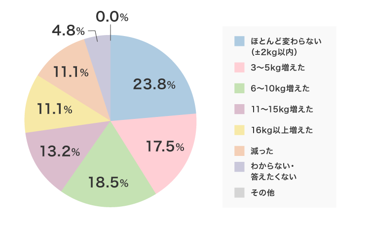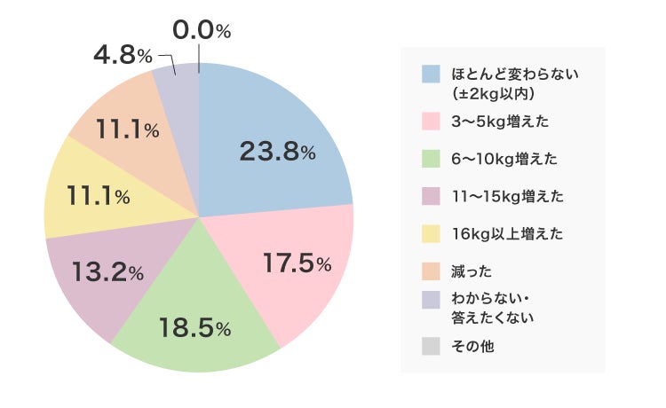 ほとんど変わらない+減ったという回答は3人に一人と少数派。16キロ以上増えた人は11.1%もおいででした。