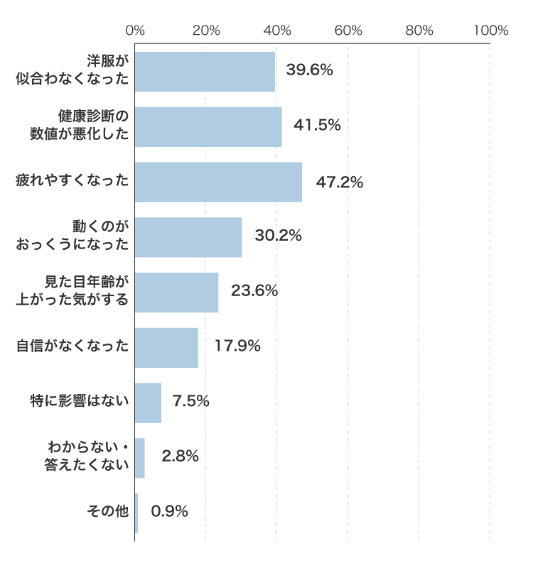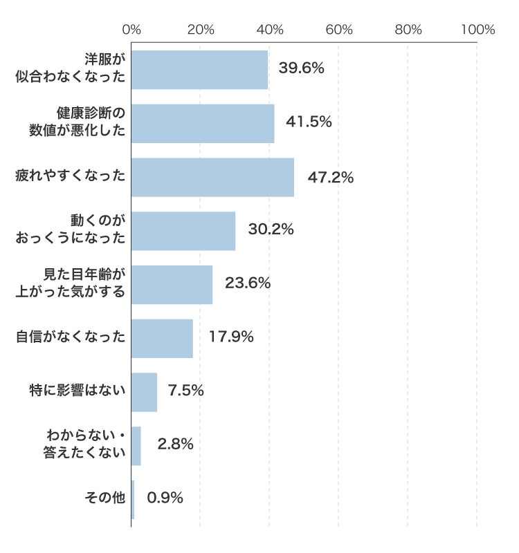 半数近くの方が体型変化で「疲れやすくなった」と感じています。「自信がなくなった」という回答が多いのも気になります。