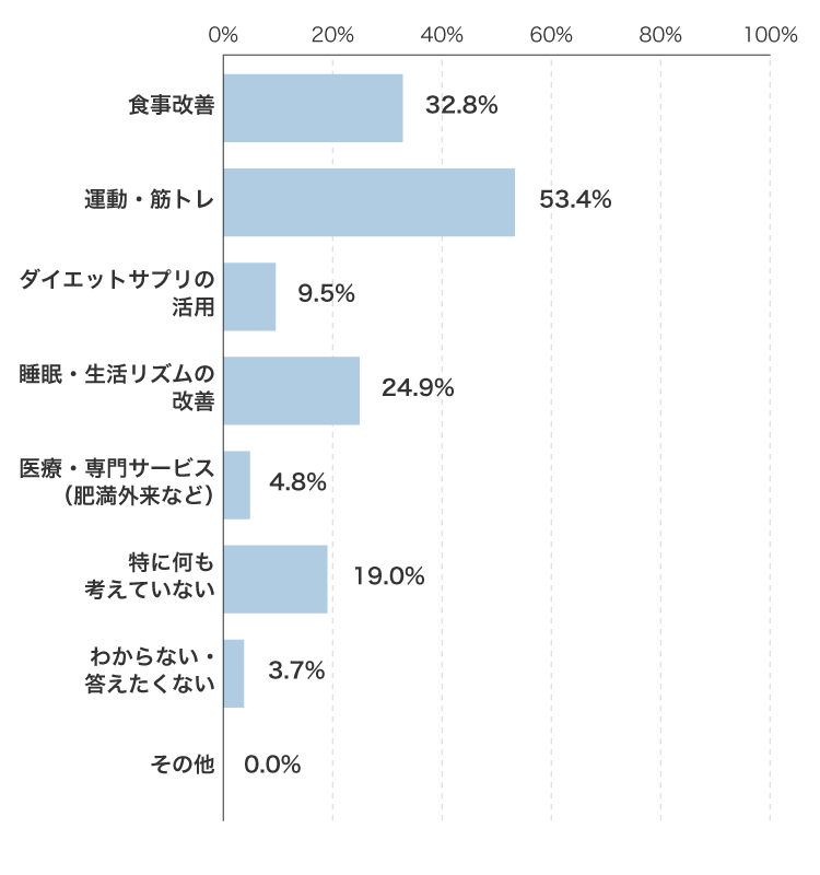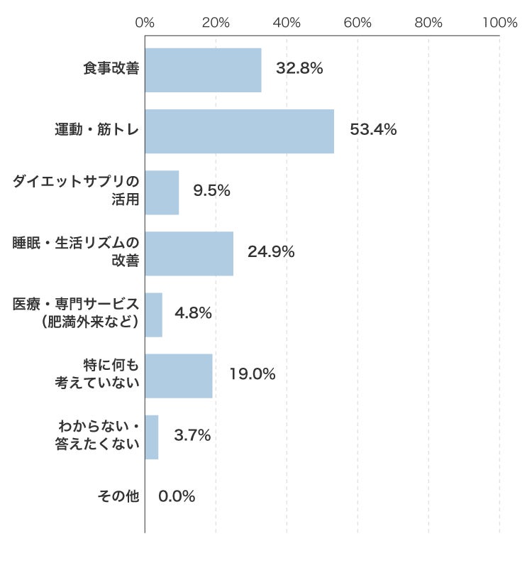 運動・筋トレが半数をこえ、食事改善と睡眠が続いています。複数を選択している人が少ないのも特徴でした。