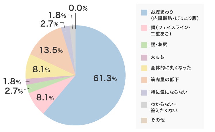 もっとも気になる体型変化の場所は「お腹まわり」が圧倒的に多く6割をこえました。次は「筋肉量の低下」をあげ、男性ならではの回答ともいえそうです。