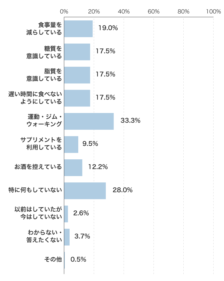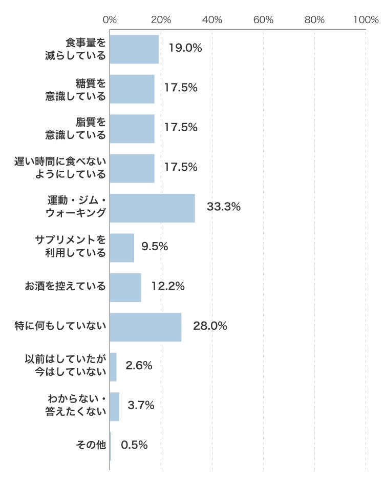 運動派は3人に一人。一方、何もしない人もそれに近い回答に。サプリメントの利用は予想以上で9.5%でした。