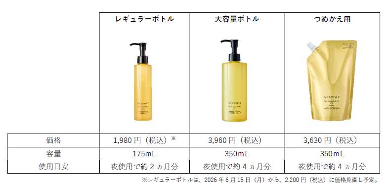 株式会社アテニアは、2026年6月15日(月)より、『スキンクリア クレンズ オイル』シリーズに、新仕様の大容量ボトルとつめかえ用を発売します。これに伴い、従来の“専用ホルダーにエコパック*をセットする仕様”から、直接ボトルに注ぎ込むタイプの“つめかえ仕様”へ変更します。