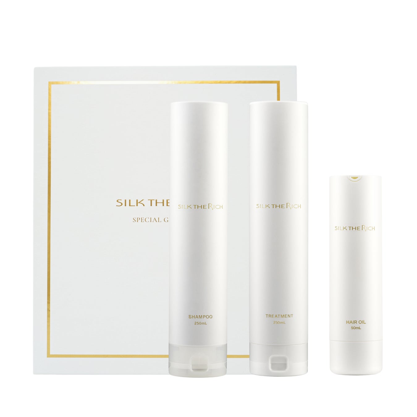 商品名:SILK THE RICH|シャンプー&トリートメント&ヘアオイル スペシャルギフトBOXセット GPF