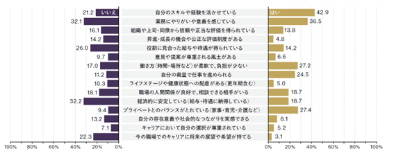 働き方やキャリアに「満足している」と答えた女性は全体の約半数でした。満足度の高低にかかわらず、スキルの活用実感、仕事のやりがい、プライベートとのバランスが共通して重要視されていました。一方で、不眠症状が強い女性ほど働き方への満足度が低下する傾向も確認され、睡眠の不調が日々の業務パフォーマンスだけでなく、キャリア全体への満足度にも影響を及ぼしている可能性が示されました。