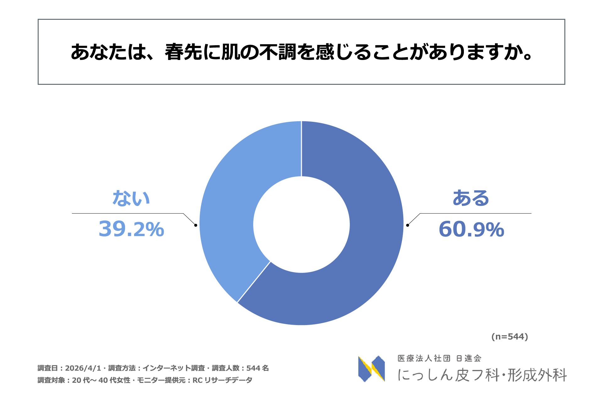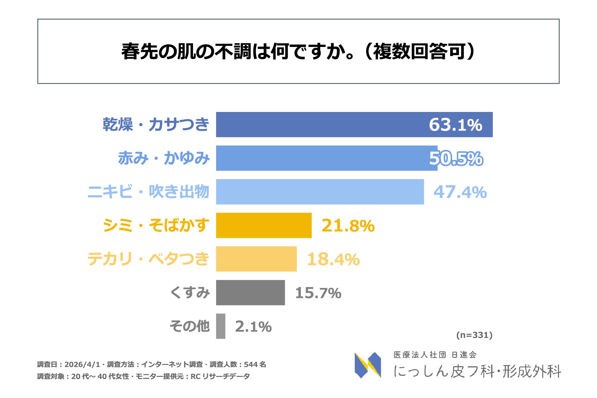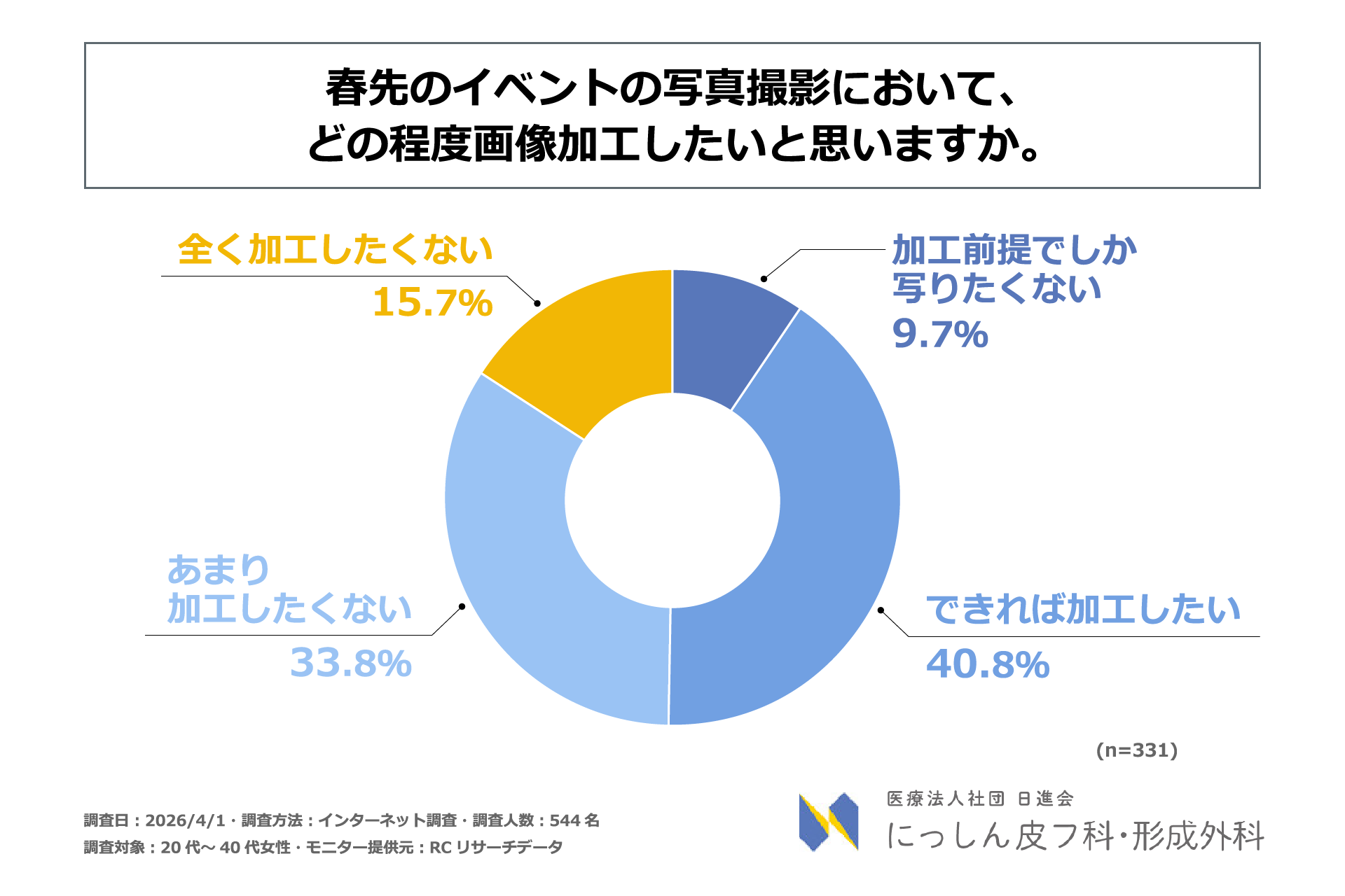 卒業式や入学式、新生活のスタートなど、春はイベントが重なり「人に会う」「写真に写る」機会が急増する季節です。同時に、花粉や寒暖差、黄砂などの影響により、肌のゆらぎや不調を感じやすい時期でもあります。第一印象や写真写りへの意識が高まる中、春特有の肌トラブルが重なることで、本来は楽しいはずのイベントで「写真に写りたくない」「加工なしでは人前に出られない」といった心理的な負担を感じ、写真撮影などの行動を回避してしまう女性は少なくないと考えられます。しかし、季節的な肌不調が、写真撮影の回避といった具体的な対人行動にどのような影響を及ぼしているのか、その実態を定量的に示したデータは不足しています。そこで、医療法人社団 日進会 にっしん皮フ科・形成外科は、20代~40代女性を対象に「春先の肌不調が対人行動に及ぼす影響に関する調査」を実施しました。