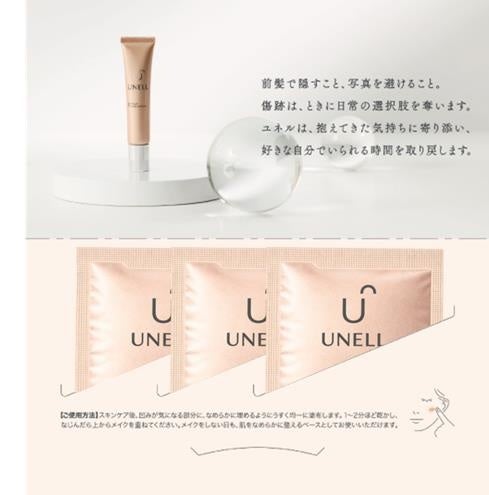 6月より展開する無料サンプリングキャンペーンは、顔に傷跡がある方を対象として、先着で1,000名様(1世帯1名様のみ)に3回分のセットを御提供いたします。この機会にぜひユネルの「フィリングアンドスムージングプライマー」をお試しください。