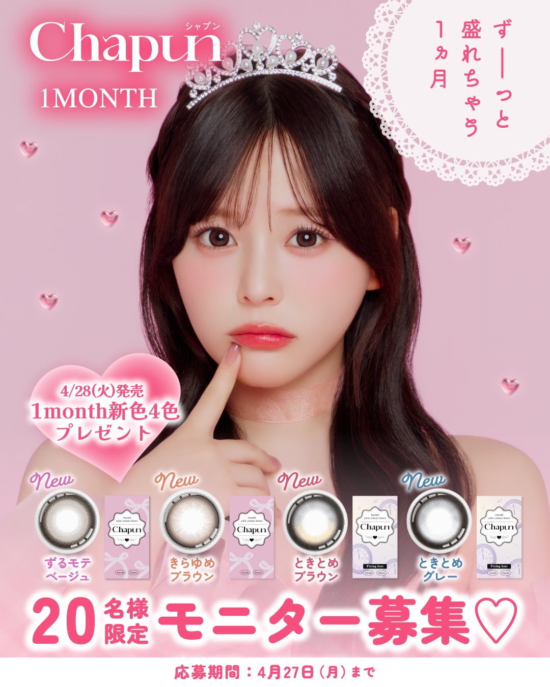 『Chapun』マンスリーレンズ発売を記念して、ご自身のSNSアカウントにてレビュー投稿いただける方に4月28日(火)発売のマンスリーレンズ全4色を各1箱ずつプレゼントいたします。