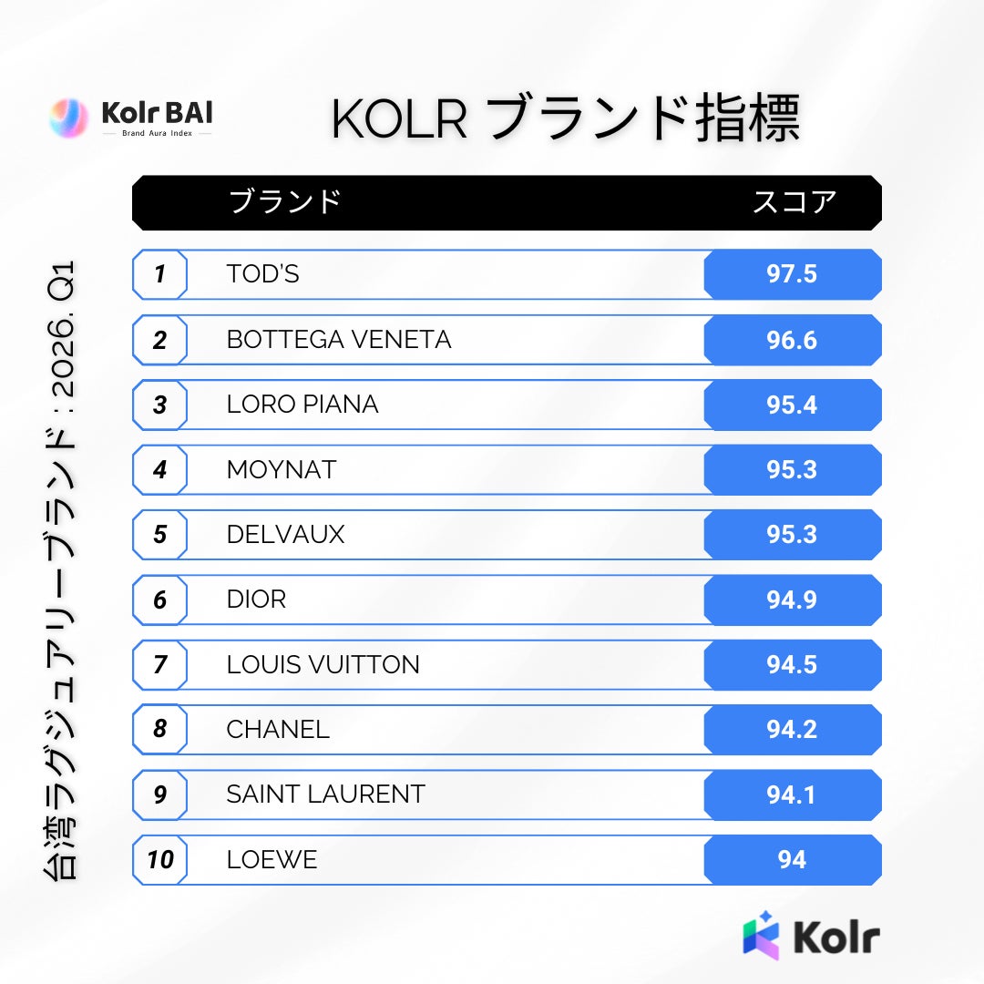 iKalaグループが提供するマーケティング・インテリジェンス・ソリューション「 Kolr」 は、アジア市場におけるブランドのインフルエンサーマーケティングの成果を評価するランキング「Brand Aura Index」2026年第1四半期版を発表しました。今回のレポートでは、台湾のラグジュアリー市場およびビューティー市場におけるインフルエンサーマーケティングの成果を分析しています。