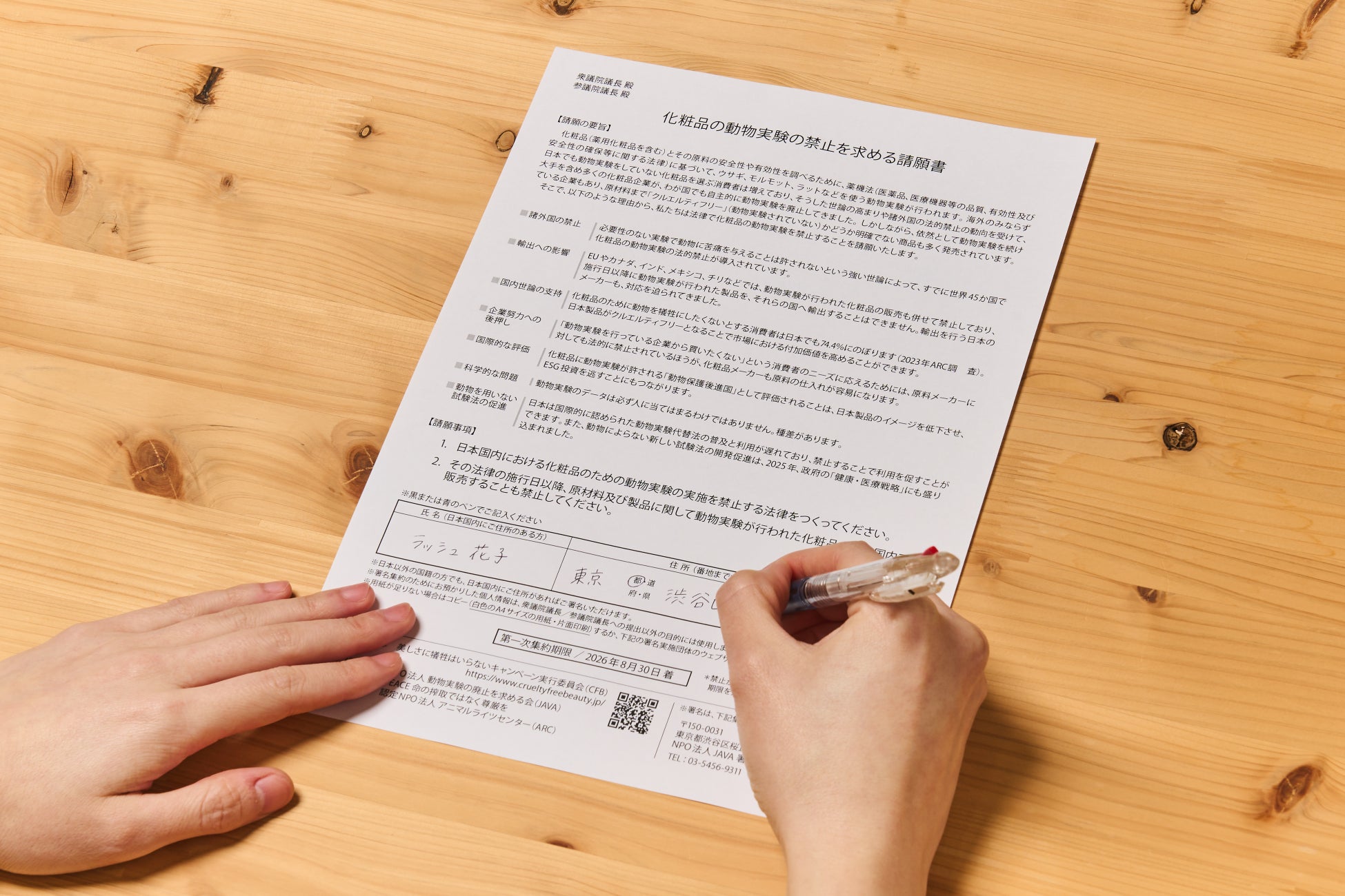 ・内容:「化粧品の動物実験禁止を求める国会請願署名」用紙の配布・回収の実施