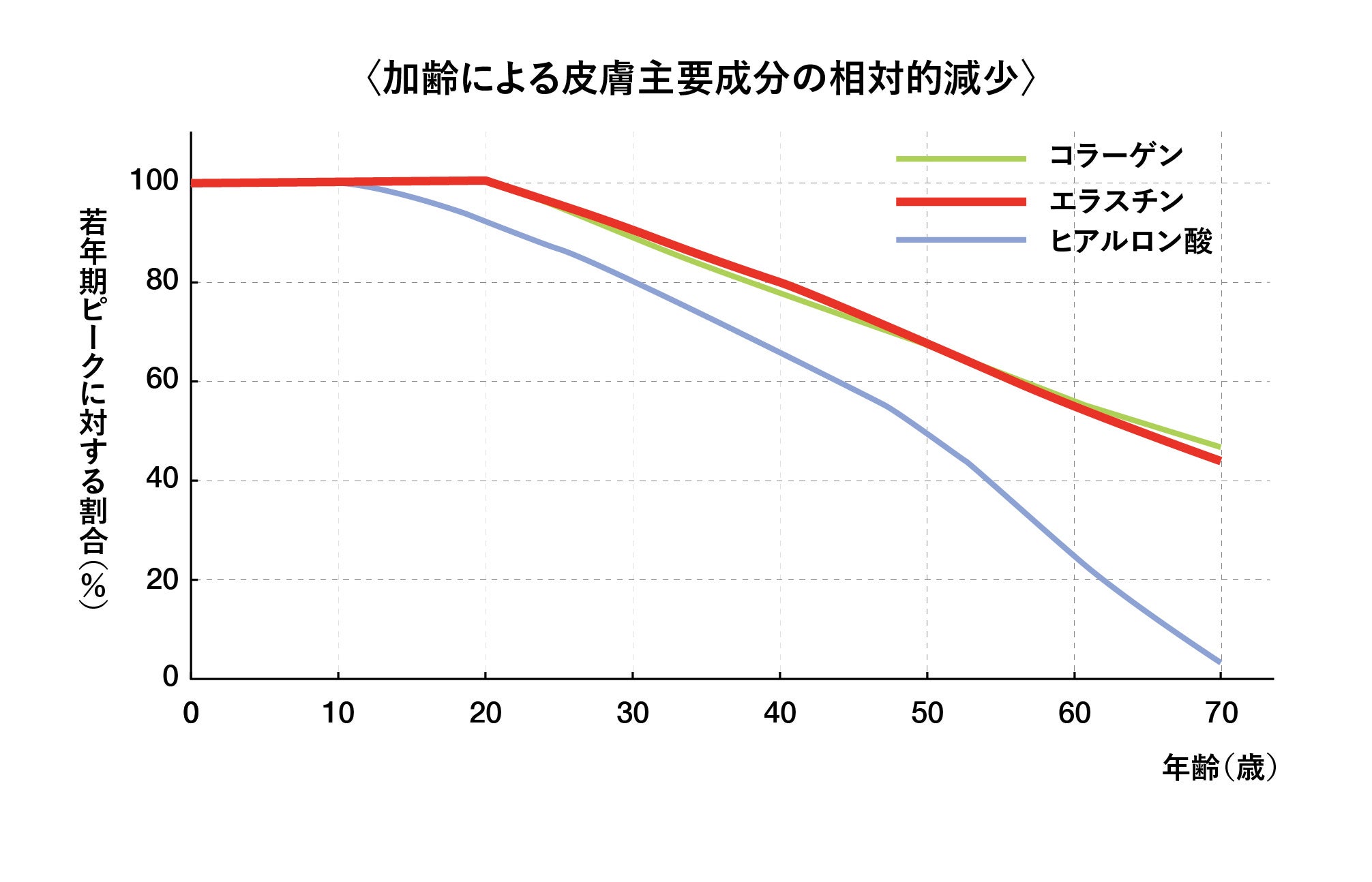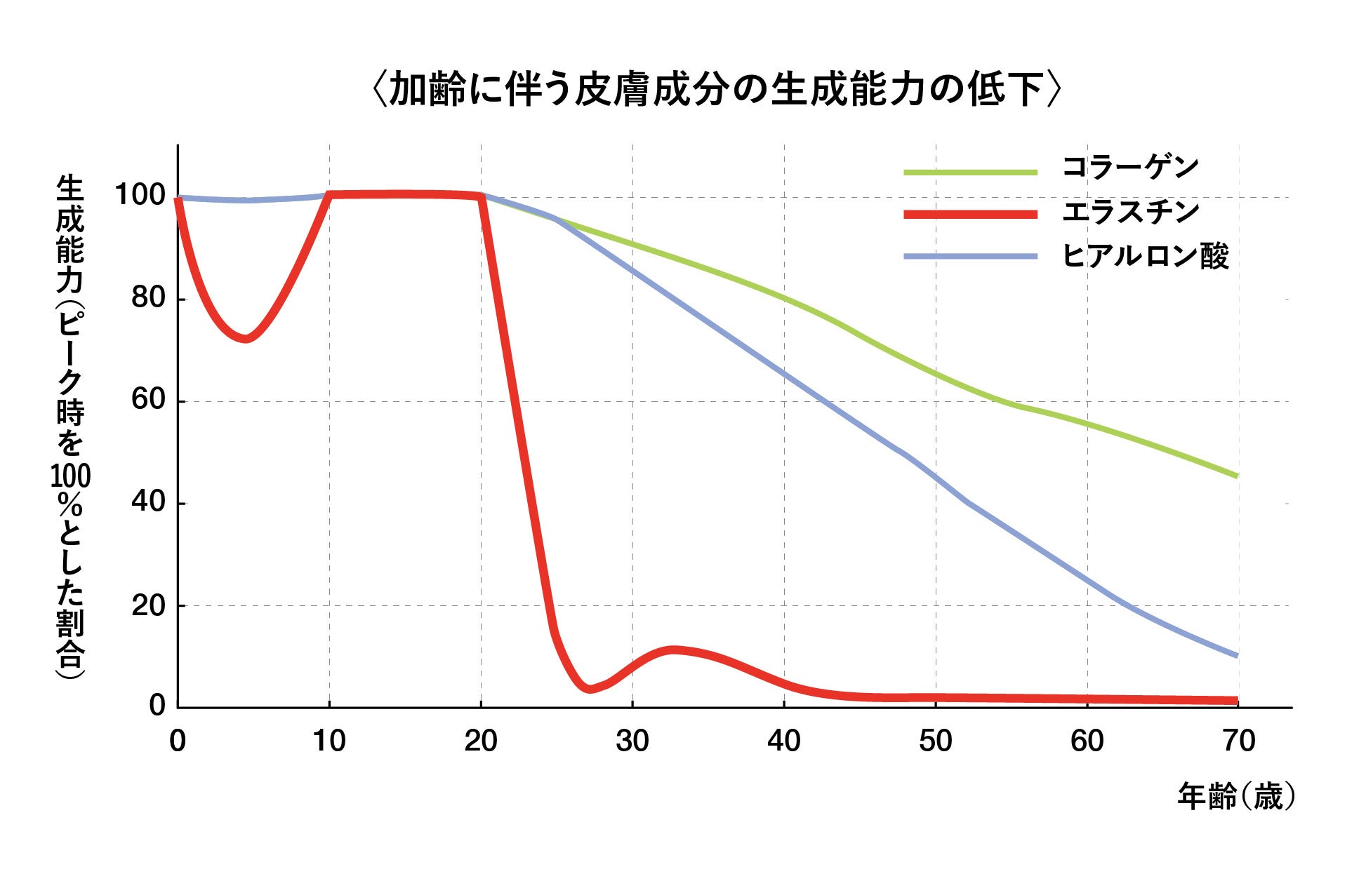 エラスチンの変化は、外的要因だけでなく年齢による生成能力の低下とも大きく関係しています。一般的に、20代までの肌では【生成量 > 分解量】というバランスが保たれていますが、30代以降になると【生成量 < 分解量】へと移行します。
