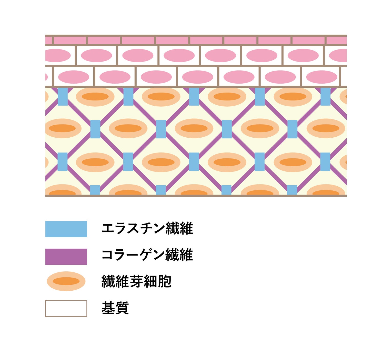 肌のハリや弾力は、真皮に存在するコラーゲンとエラスチンという2つの線維成分によって支えられています。