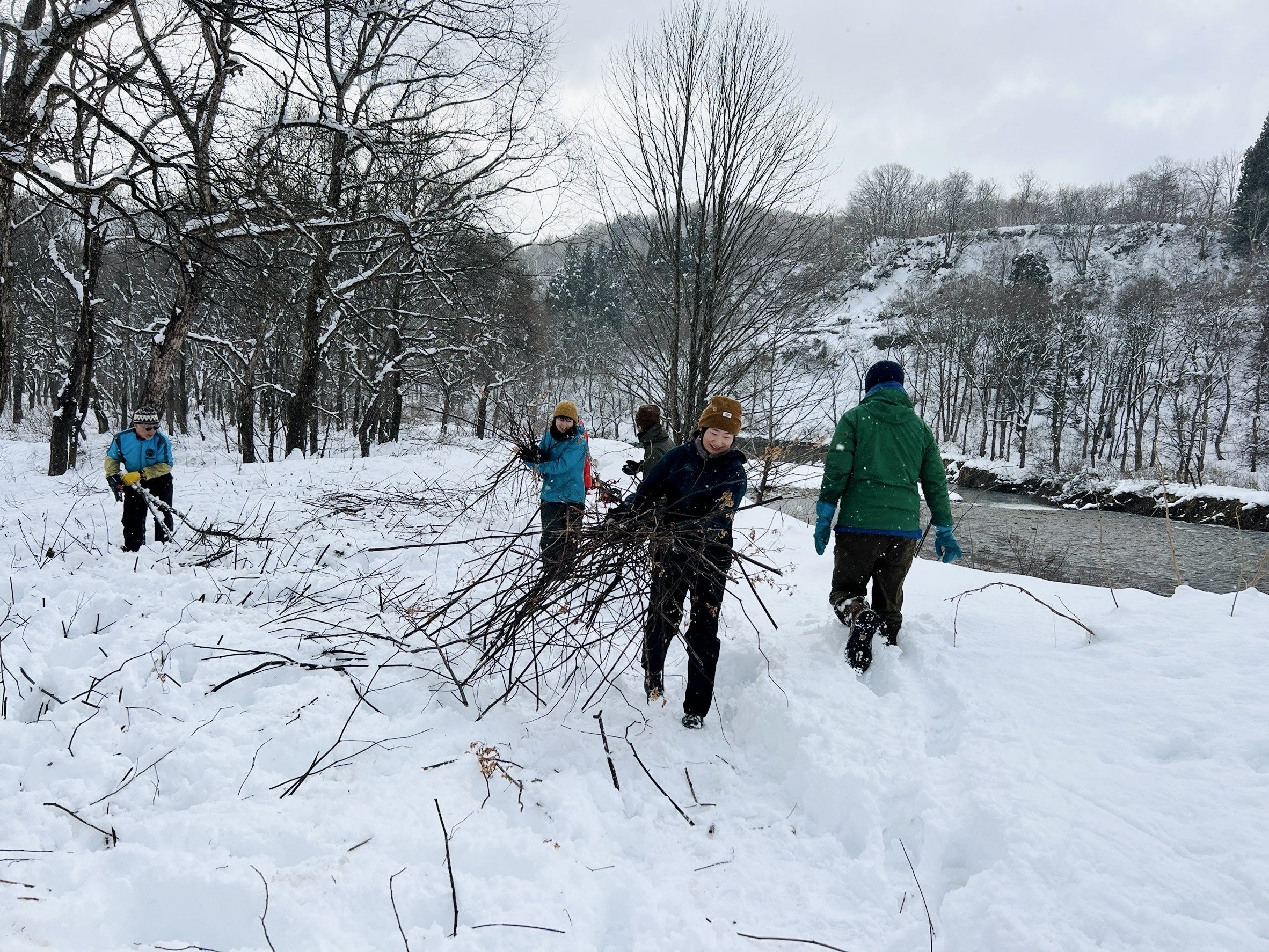 • 飯豊町では「水没林」の美しい景観を未来へ残すため、毎年秋から冬にかけて、地元有志による「白川湖フィールド整備」としてシロヤナギの生育環境向上や下草刈りを行っています。