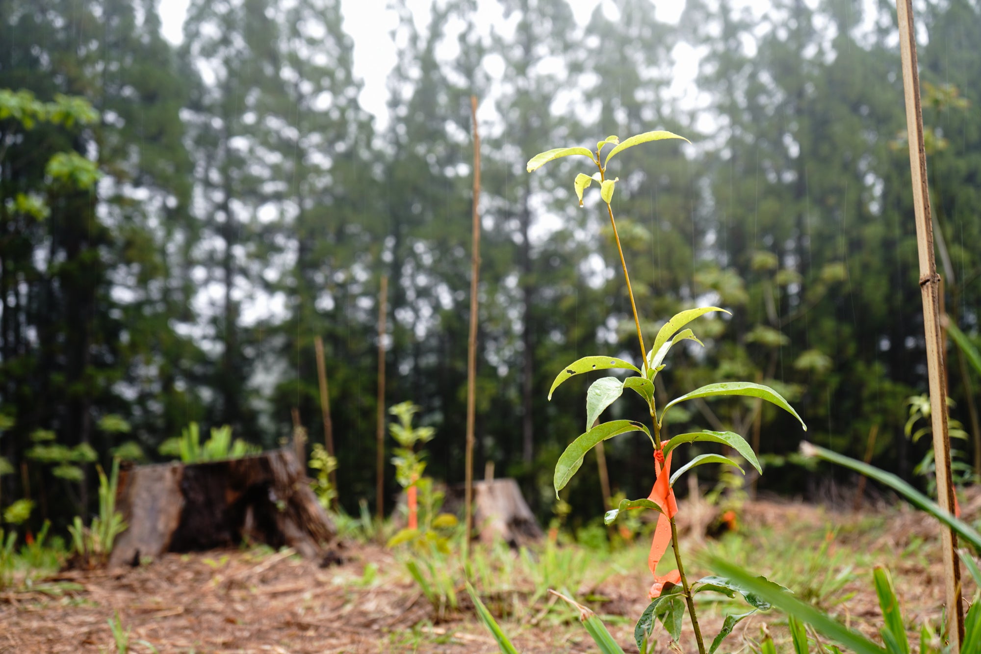6年目となる今年は、1,688本の苗木を寄贈。4月19日に行われた植樹イベントでは、熊本県竹内副知事、山都町坂本町長、一般参加者、地元住民や高校生たち、ロクシタンジャポンの山本社長含む社員7名に加え、この活動に共感された石田ニコルさんも植樹イベントに初参加。寄贈した苗木の一部である、この土地に適した29種の苗木500本を、恵の雨が降り注ぐ中、約80名で植樹しました。