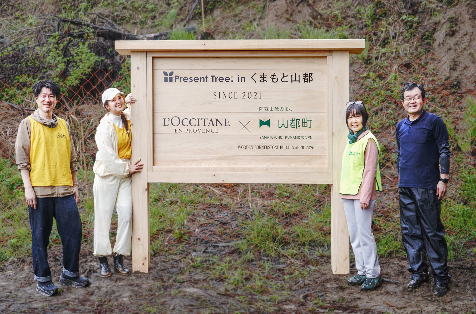 さらにメゾン創設50周年の記念すべき今年、植栽地にプレートが建てられました。これには、自治体である山都町、「Present Tree® in  くまもと山都」を運営する認定NPO法人環境リレーションズ研究所、ロクシタンの三者の協力のもと継続的に取り組んできた証と、未来の森林再生への決意が込められています。