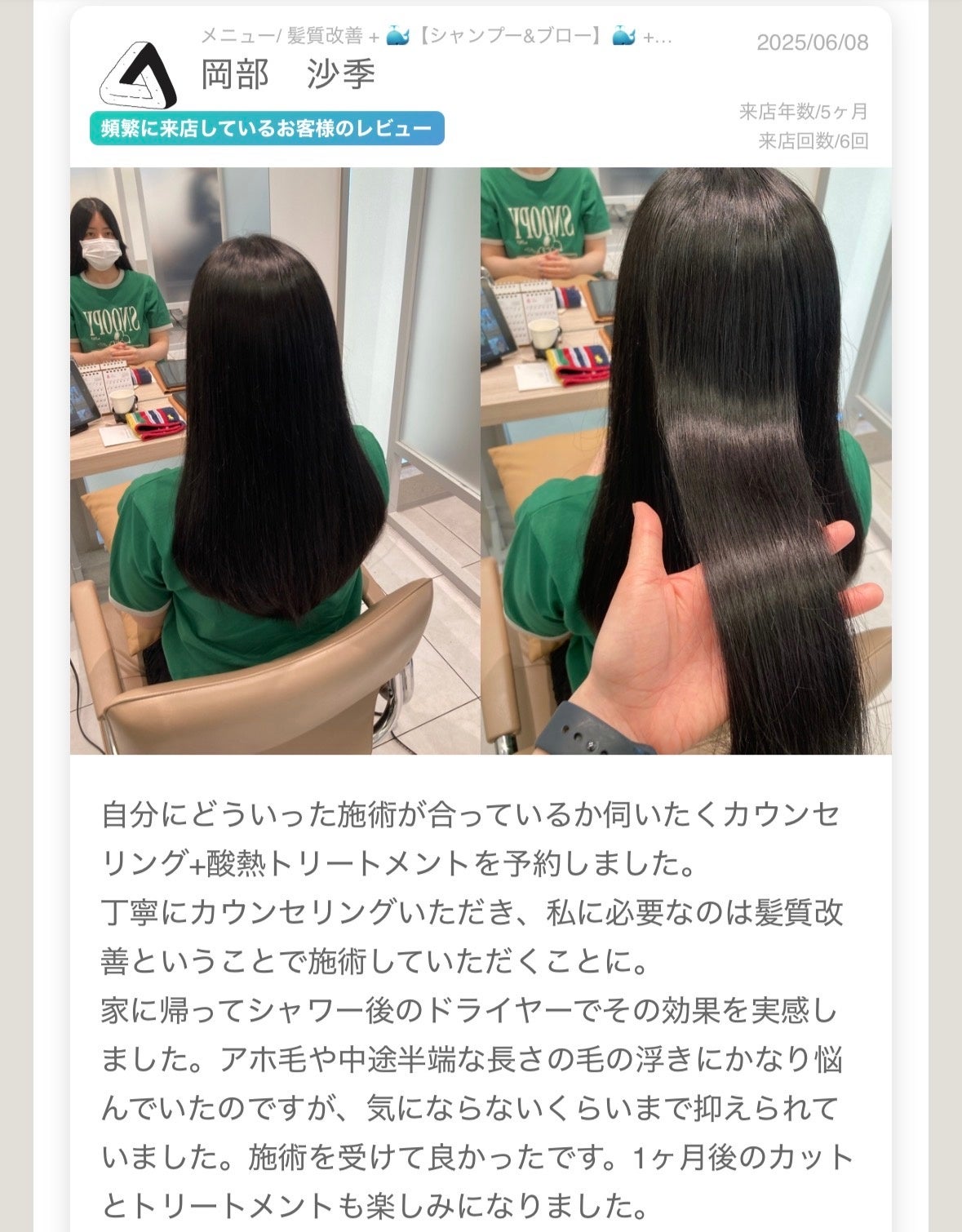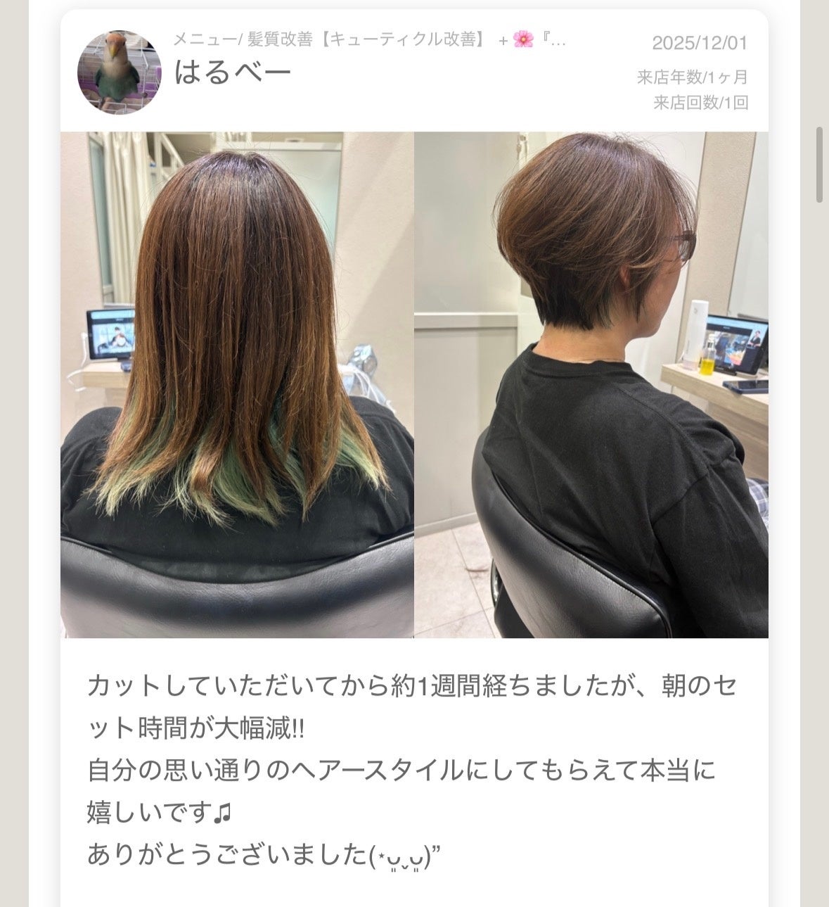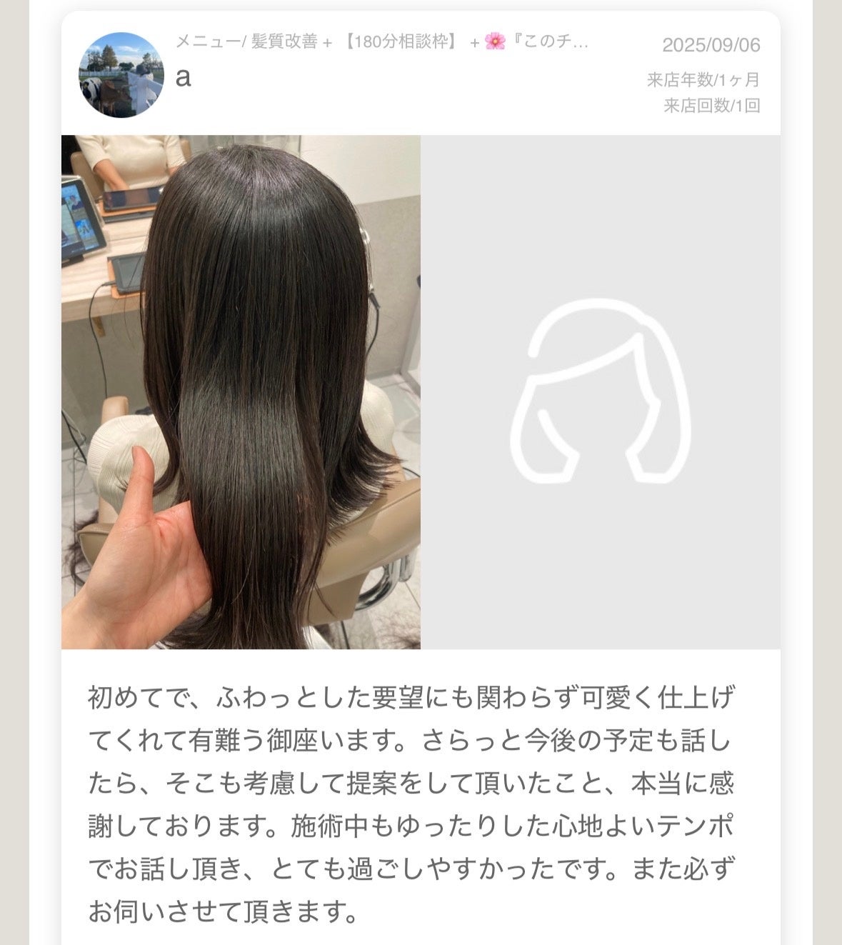 「髪質改善」「広がり」「うねり」「ダメージ」といった悩みを抱える方々が、口コミや実例を見て来店される流れが強みです。