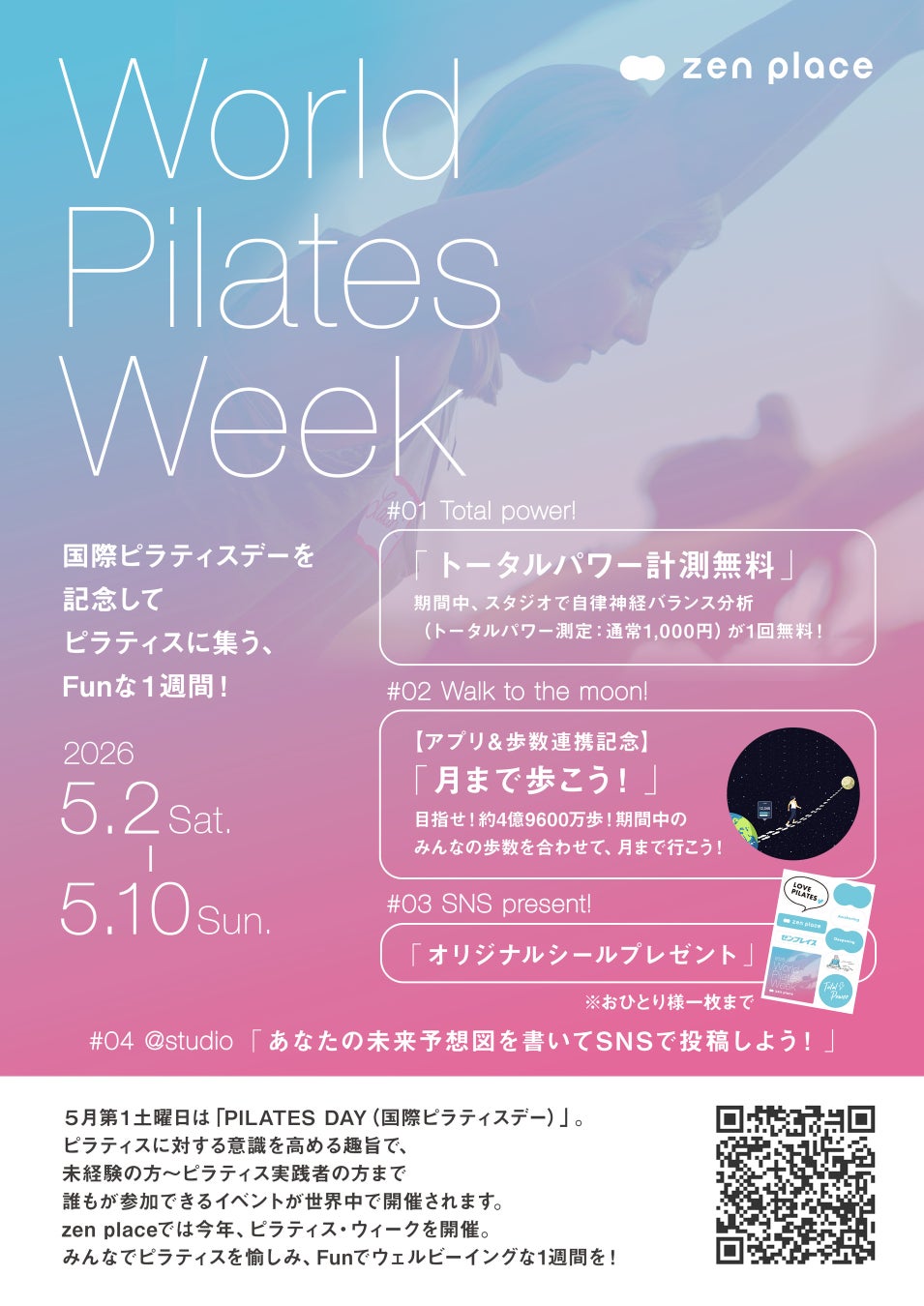 最先端研究と科学的知見をもとに、グローバルな環境で最新技術とDXを活用し、ウェルビーイング創造のリーディングカンパニーを目指す日本最大級のピラティス・ヨガ専門スタジオ「zen place」(国内150店舗/指導者1,000名以上)を運営する株式会社ZEN PLACE(本社:東京都渋谷区、代表取締役:尾崎成彦)は、国際ピラティスデー(毎年5月第1土曜日)に連動し、2026年5月2日(土)〜5月10日(日)の9日間、全国のzen place全スタジオを横断した特別企画「World Pilates Week」を開催いたします。