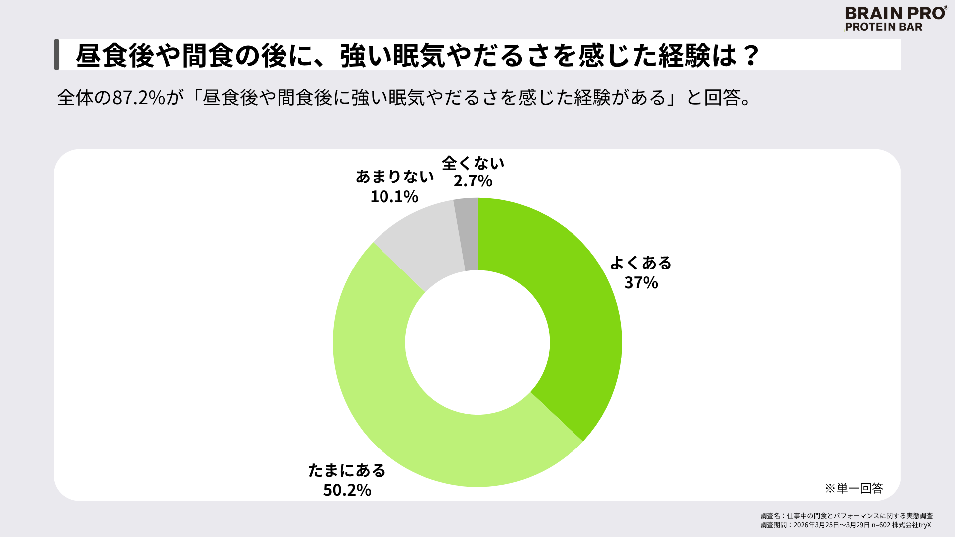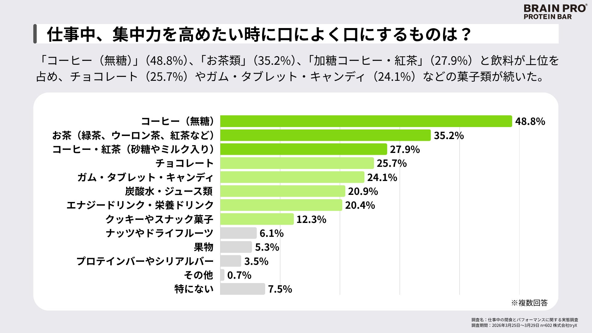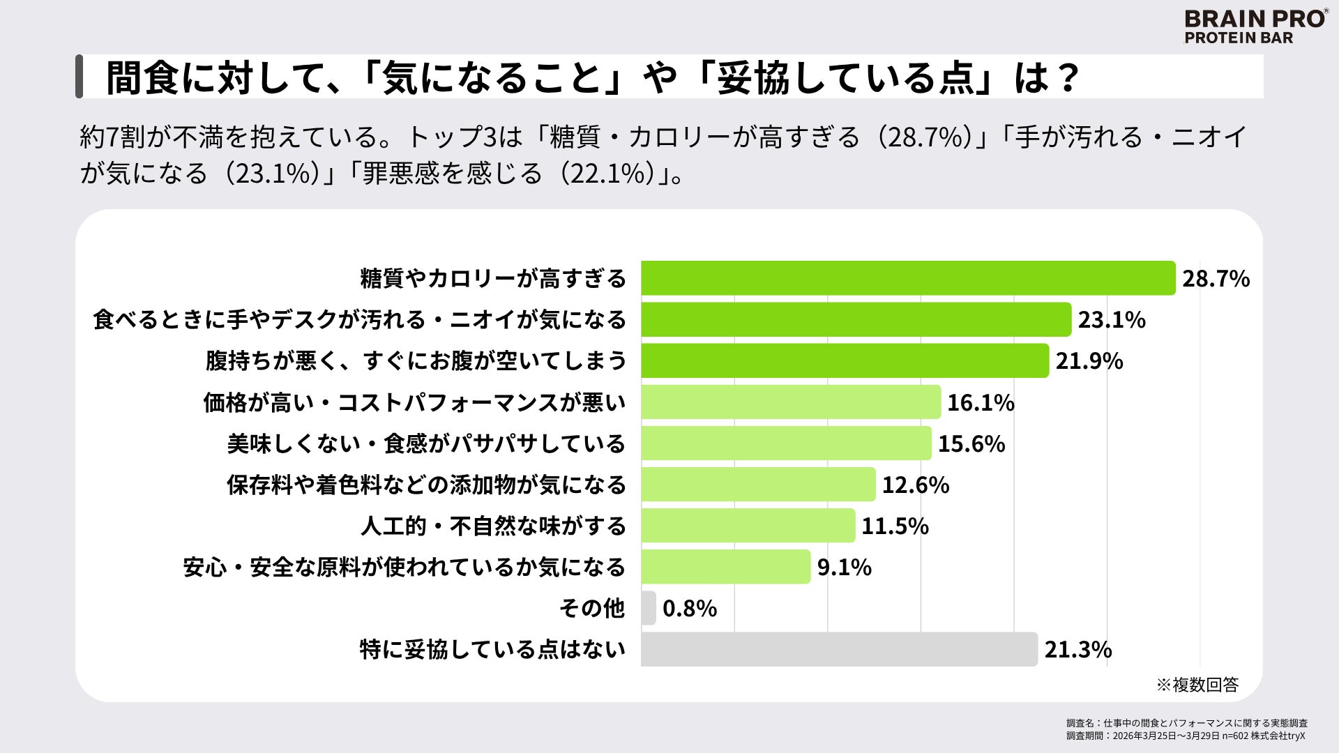 株式会社tryX(本社:東京都中央区、代表取締役:関谷 拓治、読み:トライエックス、以下「tryX」)は、2026年5月中旬発売予定のディープワーカーのためのコンディショニング・プロテインバー「BRAIN PRO(ブレインプロ)」の開発に際し、全国のビジネスパーソン602名を対象とした「仕事中の間食とパフォーマンスに関する実態調査」を実施しました。