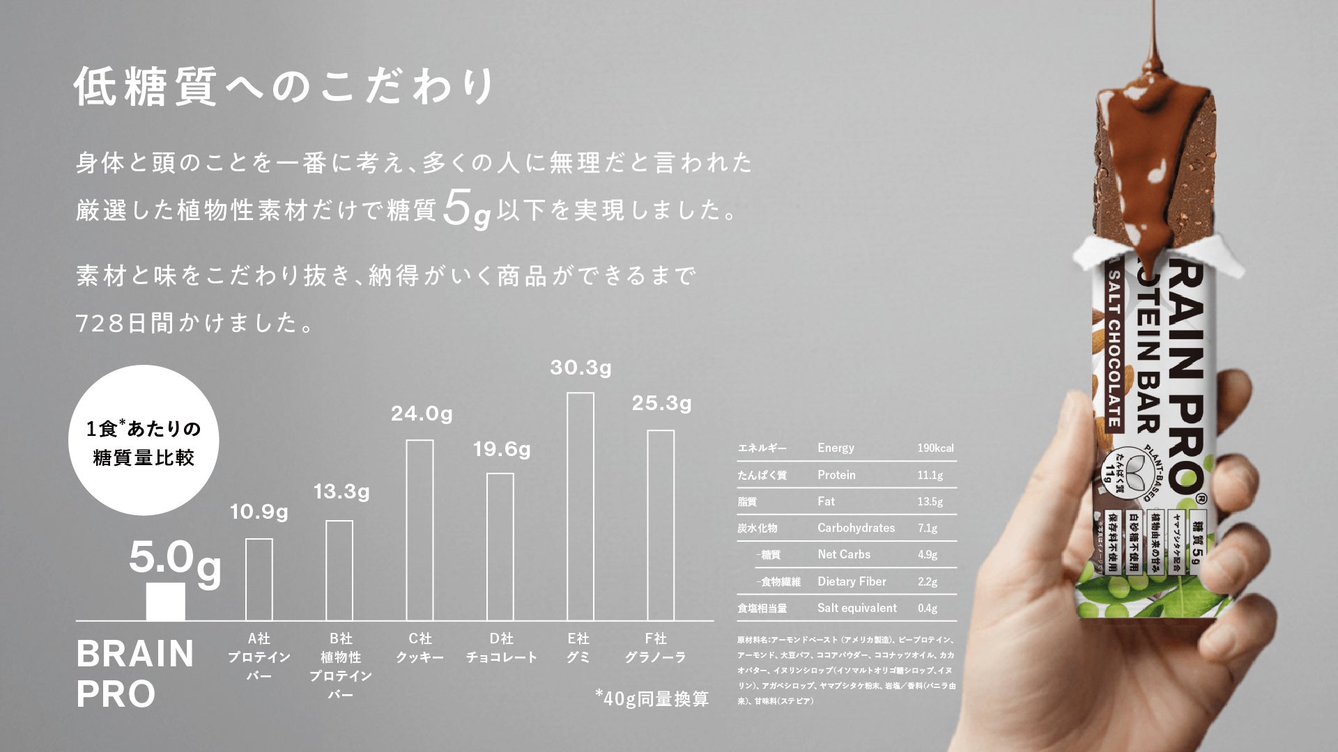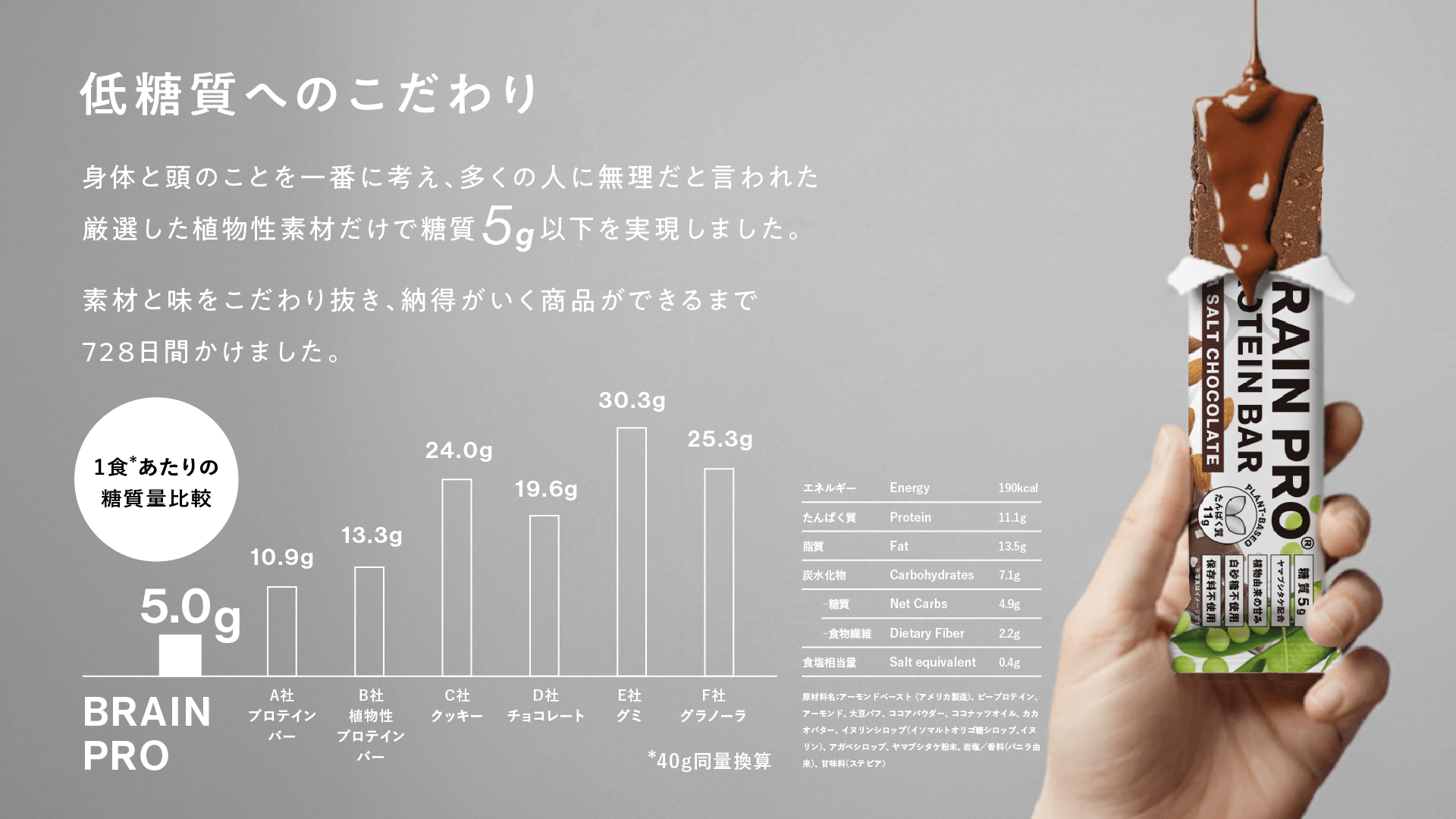 「体に良くても美味しくなければ続かない」という考えのもと、理想的な商品設計の完成まで2年と延べ200回以上の試行錯誤を経て完成。糖質5g以下でありながら、チョコレートバーとしての満足感と美味しさを兼ね備えています。