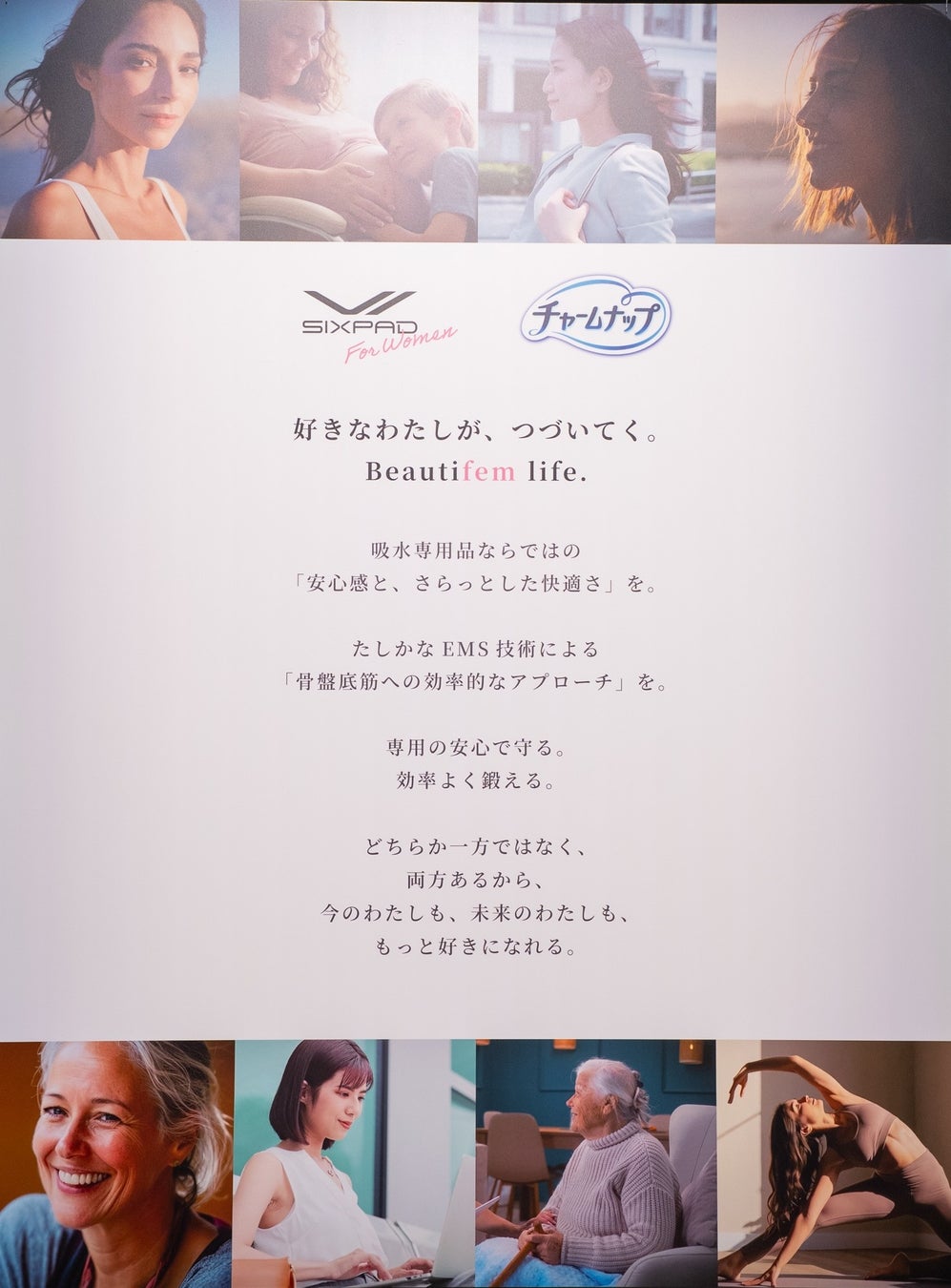 会場では、吸水ケアブランド「チャームナップ」と SIXPAD for Womenによる共同展示を実施しました。「専用の安心で守る」と「効率よく鍛える」ケアを並べて展示し、 どちらか一方を選ぶのではなく、その時々の自分の状態に合わせて選択できることが大切だという考えを提案しました。