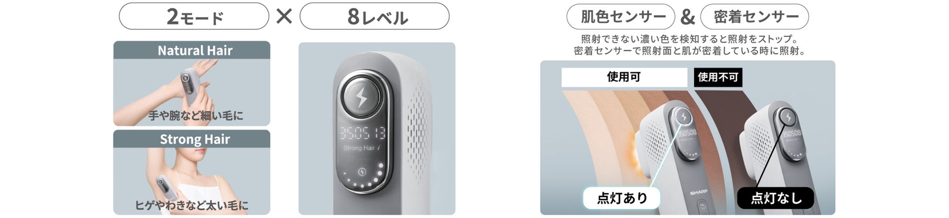 本機は、業務用美容機器の技術を応用した冷却機能「JeweL冷却」を搭載しました。照射面には光透過率が高く、冷たさをすばやく伝えるサファイアクリスタルを採用。光を効率よく肌に届けながら、照射面を約10℃まで冷却することでハイパワー照射でも刺激を抑えたケアが可能です。脚の毛にも、約2週間の使用による効果実感を確認しています。また、最速で毎秒2.5回(※3)のスピーディーな連続照射に対応し、短時間で効率よくお手入れができます。さらに「Strong Hairモード」「Natural Hairモード」の2つのモードと、各モード8段階の出力設定により、肌の状態や部位に合わせて細かく調整できます。これらの機能により、自宅で手軽にできる、プロ仕様の高品質なムダ毛ケアを提供します。