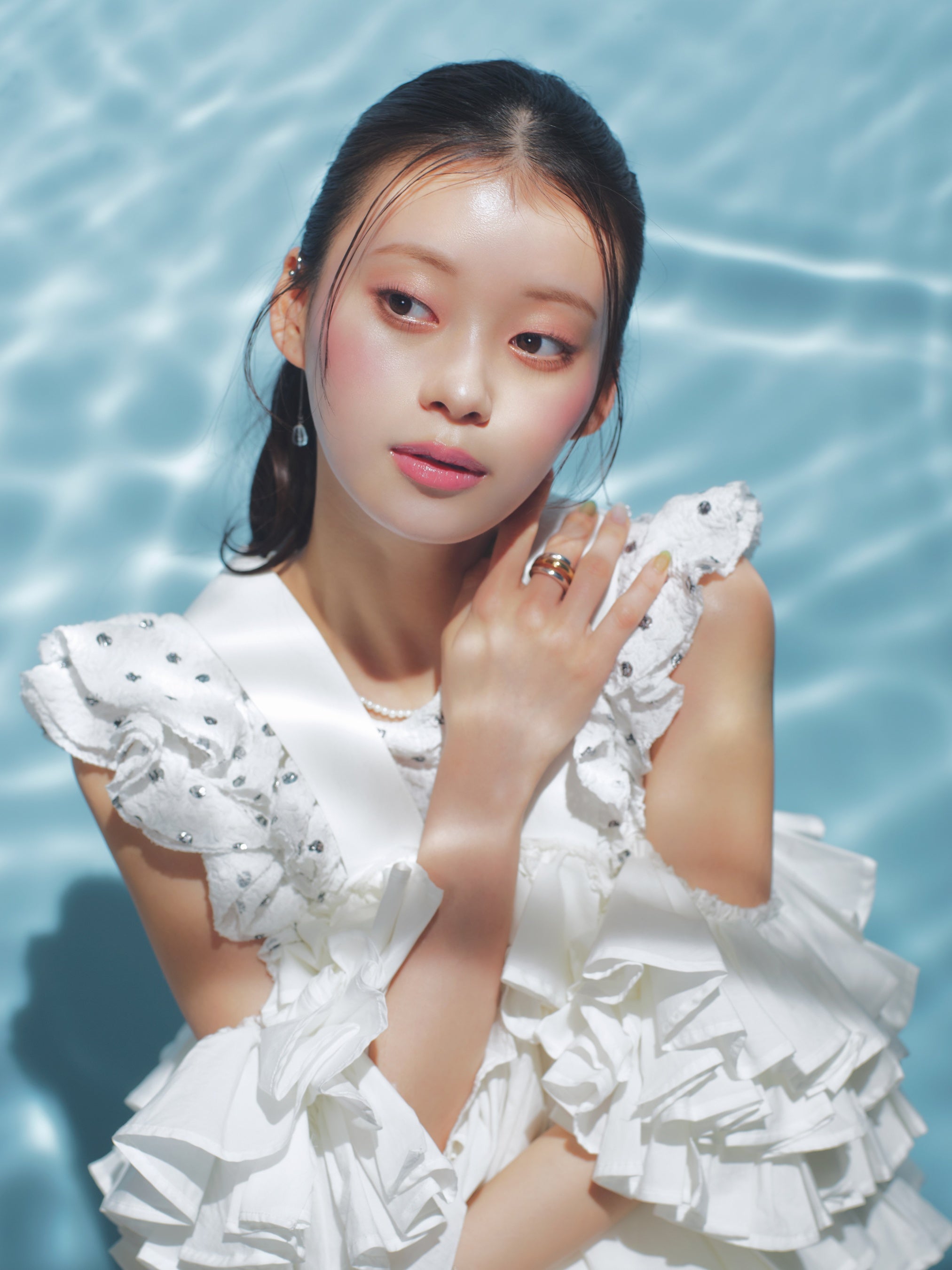 ルックではツヤとローズのニュアンスで健康的な血色感を演出。頬には赤みチークで丸みを持たせ、高い位置にピンクを重ねて一体感を。唇はピンク、青みの順で乗せるとほんのり涼しげな印象に仕上がります。