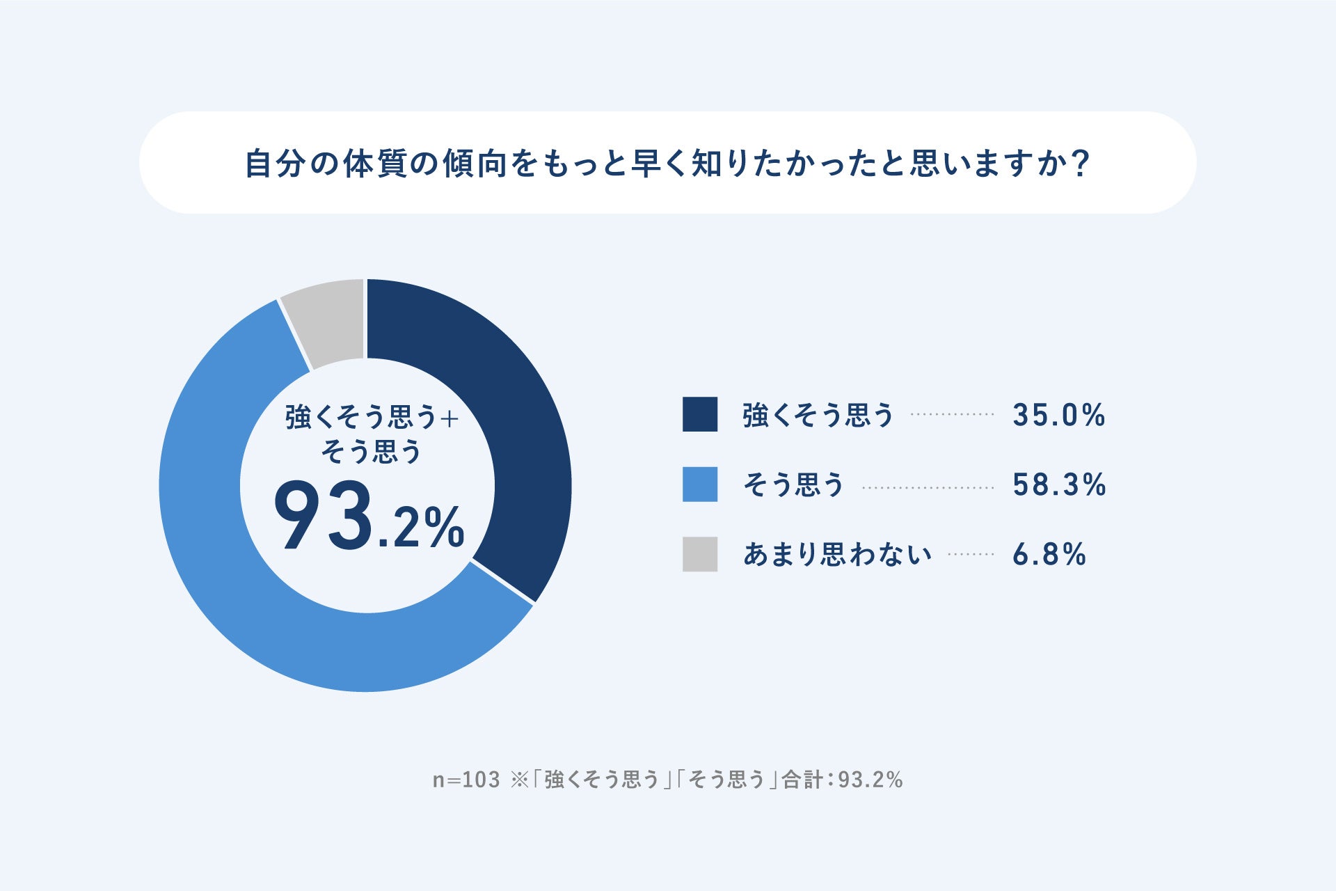 体質傾向を知って「もっと早く知りたかった」と思ったかを尋ねたところ、「強くそう思う」35.0%(36人)、「そう思う」58.3%(60人)となり、合計93.2%(96人)が肯定的に回答しました。