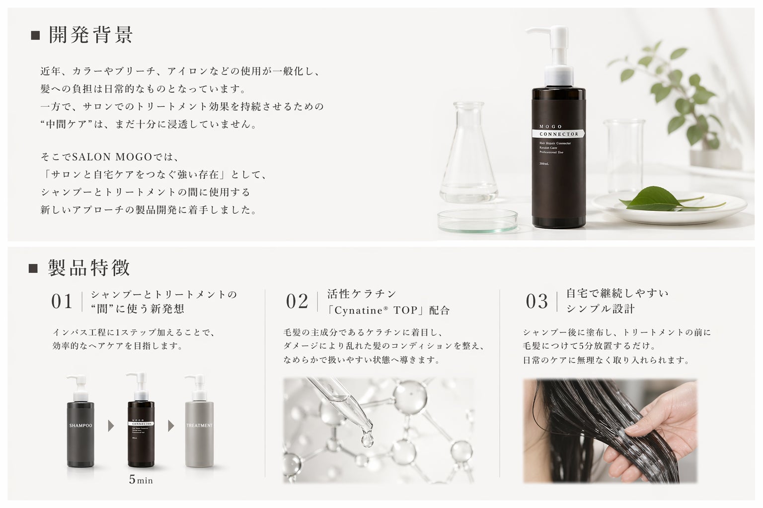 SALON MOGOでは、サロン施術とホームケアの両軸から“髪質感の向上”にアプローチする商品開発を進めてまいります。