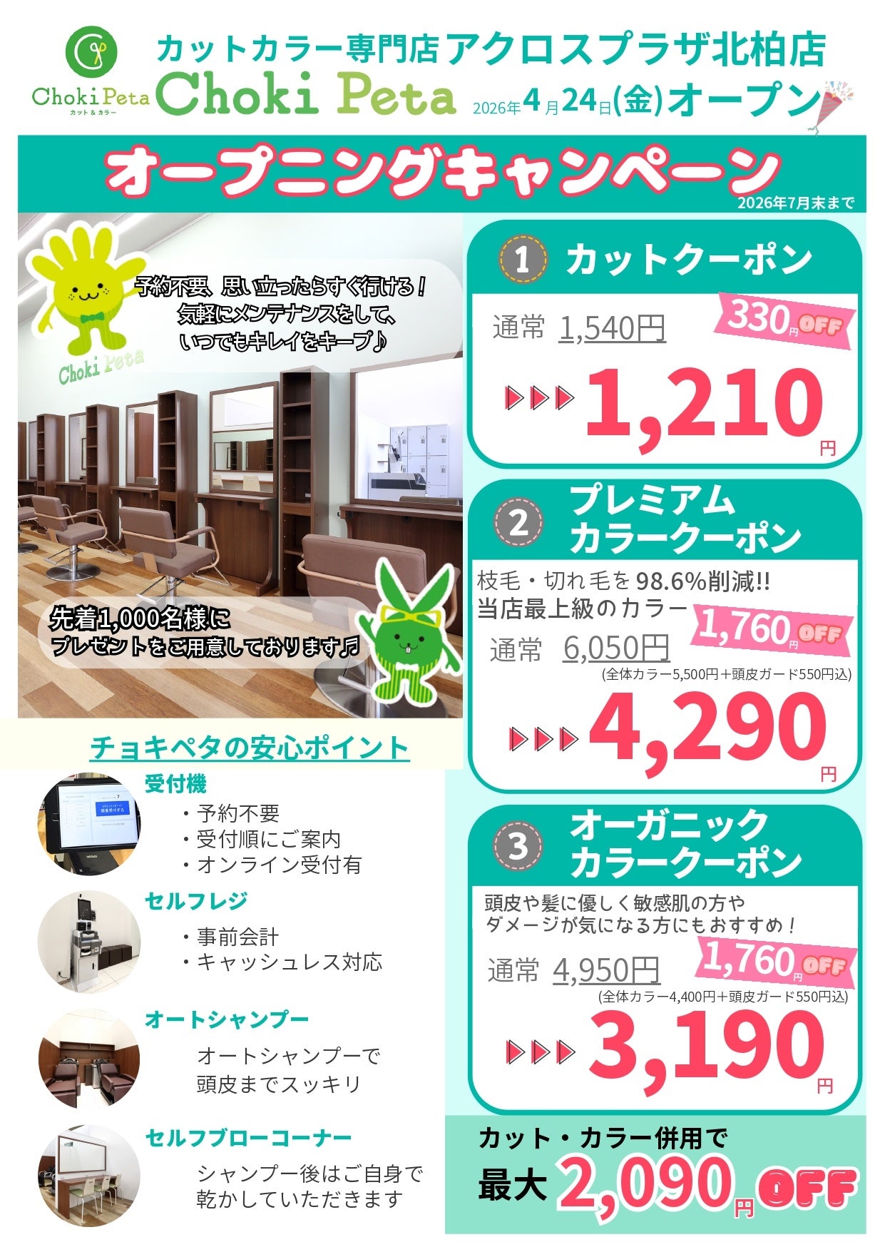 カットカラー専門店 チョキペタ アクロスプラザ北柏店が4月24日(金)オープン