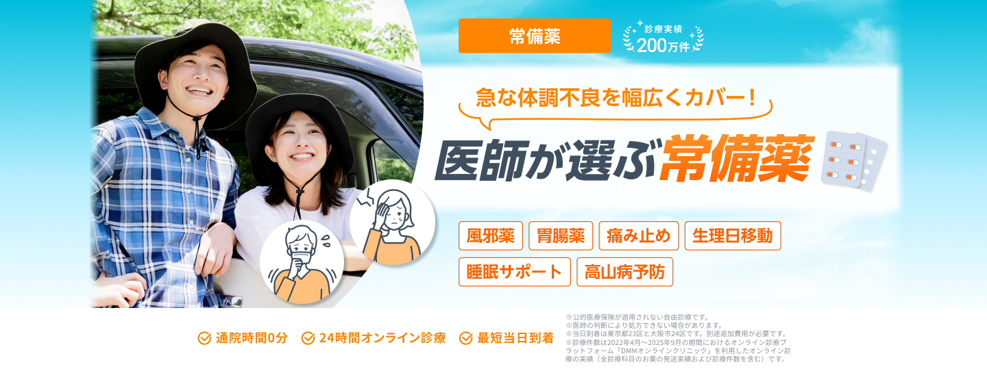 合同会社DMM.com(本社:東京都港区、イノベーションカンパニーCEO:緒方悠、以下DMM)と医療法人社団DMH(理事長:島佑介)の連携事業であるオンライン診療プラットフォーム「DMMオンラインクリニック」は、2026年4月23日(木)より旅行中や外出先での急な体調変化に備えるための「常備薬」に関する診療及び医療用医薬品の処方、受け渡しを開始いたします。