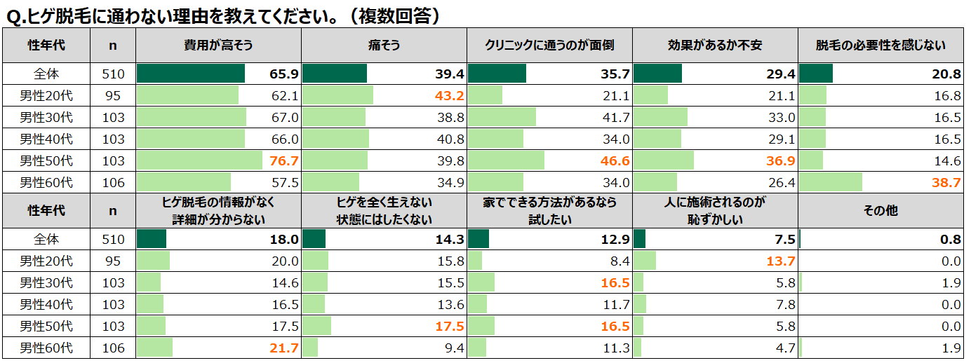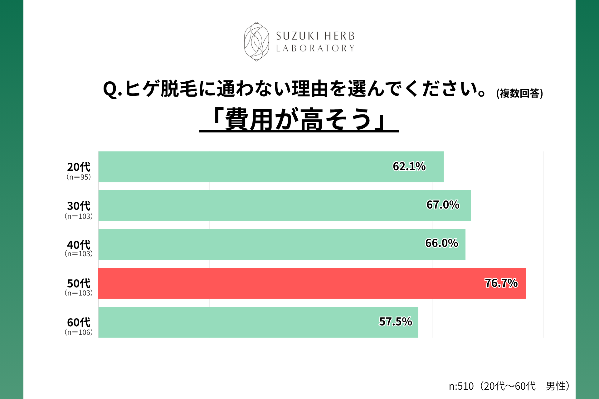 ヒゲ脱毛に通わない理由を複数回答で聞いた項目(n=510)では、「費用が高そう」が全年代で最も多い結果でした。ヒゲ脱毛への興味が全年代で最も高かった50代(n=103)では、「費用が高そう」(76.7%)、「クリニックに通うのが面倒」(46.6%)、「痛そう」(39.8%)、「効果があるか不安」(36.9%)が主な理由となっていました。
