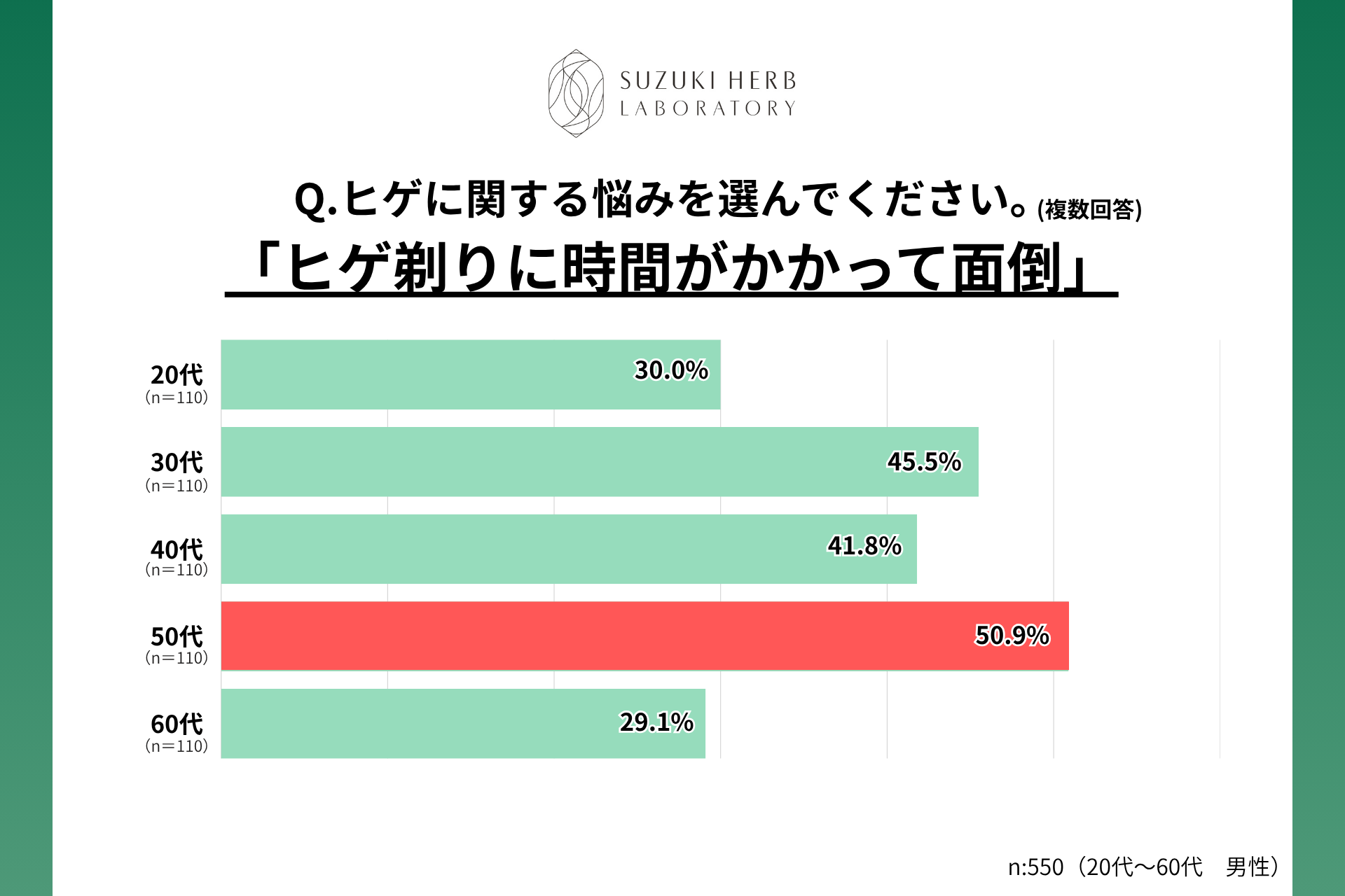 また、ヒゲについての悩みを複数回答で聞いた項目(n=550)では、全体(n=550)では「ヒゲ剃りに時間がかかって面倒」(39.5%)、「ヒゲ剃りで肌が荒れる、血が出る」(35.1%)、「清潔感がないように見える」(27.1%)の順で多い結果でした。上位2つの理由は50代の割合がもっとも高く、「清潔感がないように見える」は40代の割合がもっとも高い結果でした。
