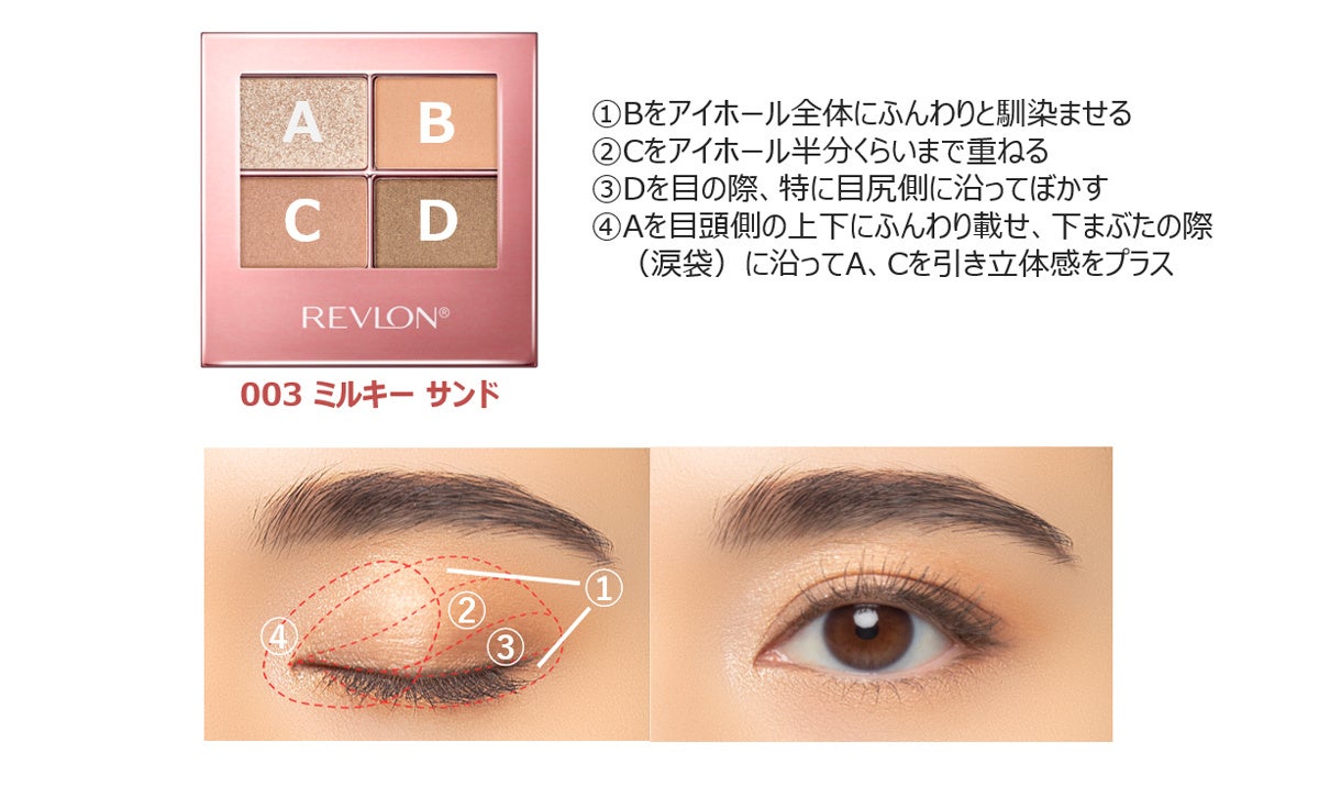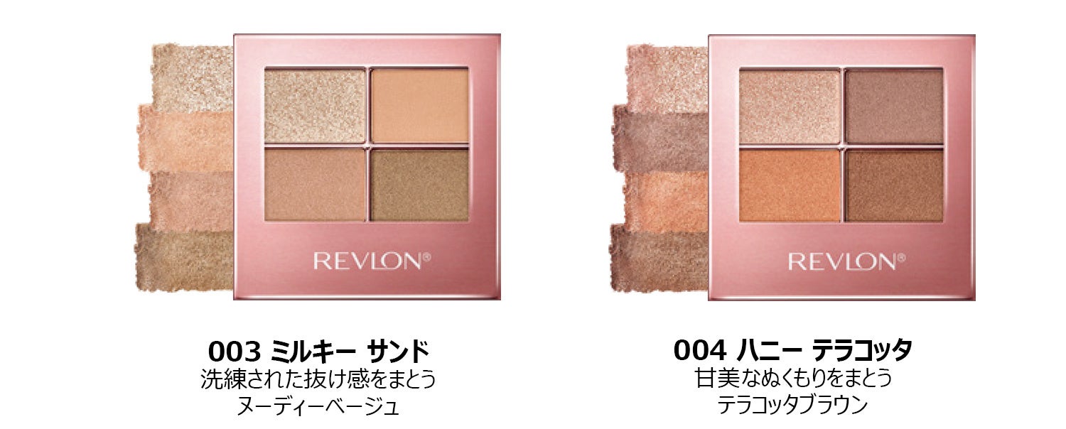 『レブロン スキン シマー シャドウ』は、うるみツヤ質感で、肌と一体化する“スキンシマー”な輝きが立体アイを叶える4色パレットです。肌に溶け込むようなスキンカラーと繊細パール粒子が、ナチュラルなツヤ感を創り出し、誰でも簡単に“透明感のある、うるみアイ”を叶えます。
